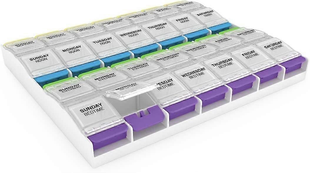 These pill planners have large push buttons that easily pop open each compartment and are excellent for those with dexterity or hand sensitivity issues. Each compartment has a rounded base for easy pill or vitamin retrieval. Ezy Dose Push Button Pill Planners are the only pill planners endorsed by the Arthritis Foundation. EASY USE - Push buttons make the planner simple to open and medication easy to retrieve and Non-Skid Bottom keeps the planner in place DAILY 4 DOSE REMINDERS - 4 daily compartments help you to easily plan and distribute your more frequent doses CLEAR LIDS - The Planner's Clear Lids allow for easy visibility of medication to help prevent missed doses LARGE COMPARTMENTS - Each planner compartment can fit 30 aspirin and has plenty of space for all of your daily medication UPC: 025715675862 Weight: 1.35 lbs