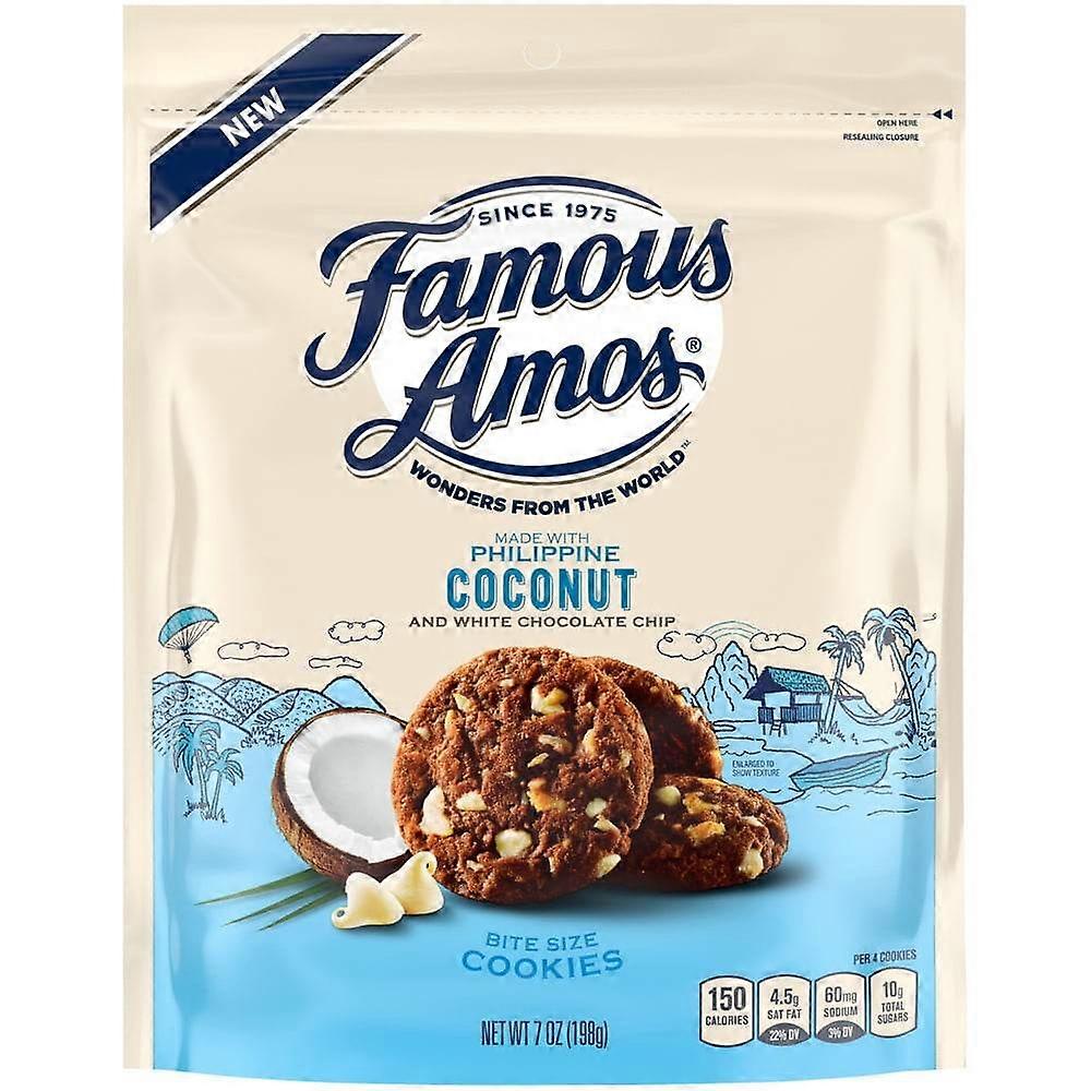 Set sail on a bite-size vacation with Famous Amos Wonders from the World. These 7-oz white chocolate chip and coconut cookies are packed and ready to go with the tastiest collection of ingredients found worldwide. After exploring the most delicious places in the world, we brought three flavors back home that delighted our palates. Famous Amos Belgian Chocolate Chip Cookies give our classic chocolate chip cookie recipe a decadent upgrade. Fresh hazelnuts brought a Turkish twist to our Mediterranean Hazelnut cookie. In the Philippines food like coconuts are a native natural wonder, and the star of our decadent Philippine Coconut chocolate cookie. This gourmet cookie snack pack contains the perfect crunchy, chocolatey sweet cookies with an ideal flavor balance of authentic coconut chips and rich white chocolate. A delicious addition to a sweet snacks gift basket, these new Famous Amos Philippine Coconut and White Chocolate Chip cookies feature high-quality, international ingredients with decadent Philippine coconut in every classically famous crunchy bite. Famous Amos's latest travel-sized crunchy chocolate coconut cookies are just one of three new recipes ready for take-off. Famous Amos Wonders from the World is your first-class ticket to savor the world in a bite.