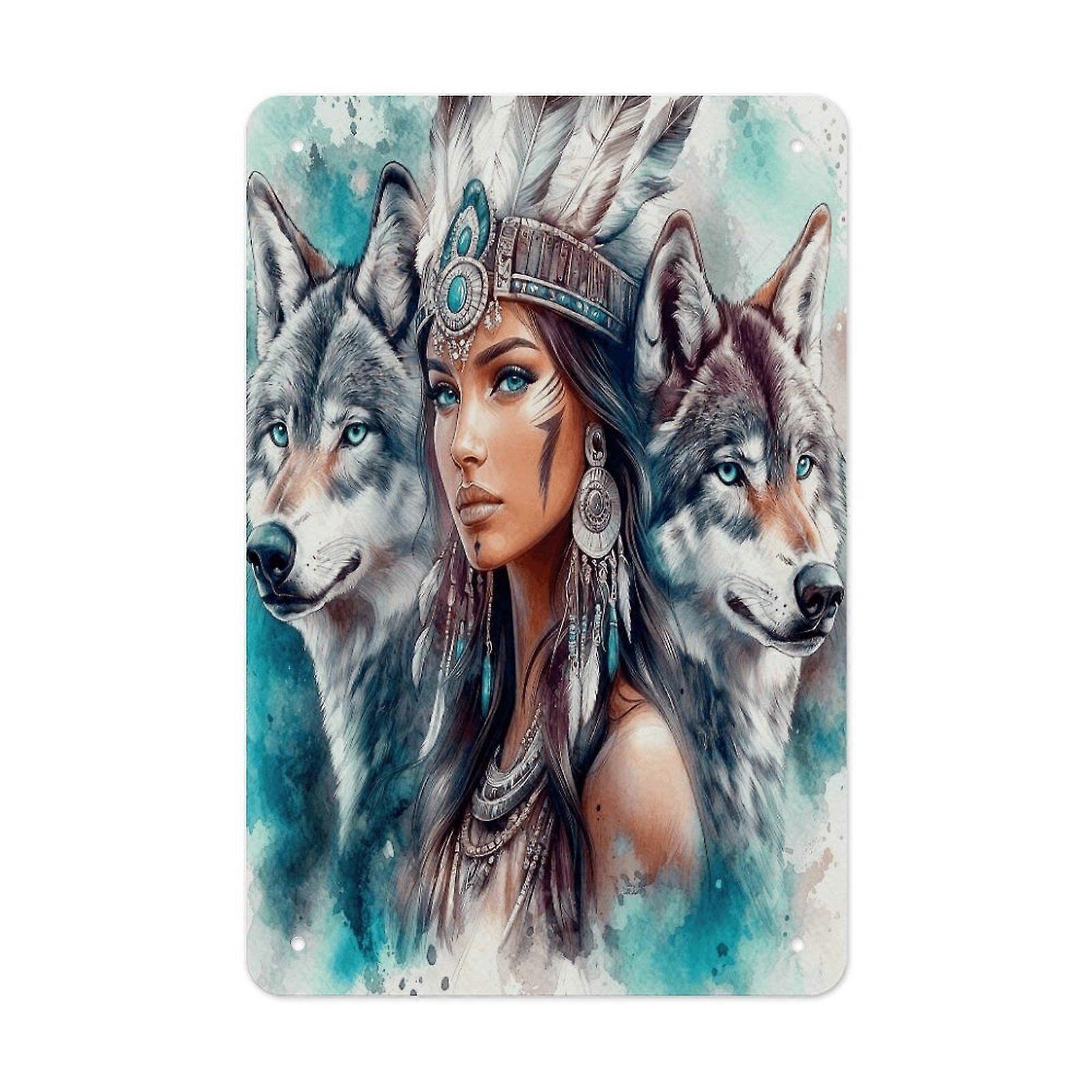 Fantasy Wolf Guardian Woman Metal Tin Sign Vintage Animal Wall Art Rustic Home Decor