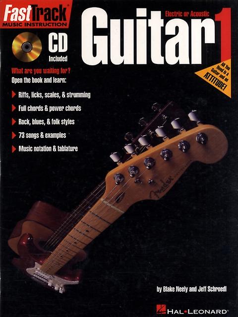 Fast Track Music Instruction. For electric or acoustic guitar or both Teaches music notation tablature Full chords and power chords riffs licks and scales and rock and blues styles. Method Book 1 includes 73 songs and examples.