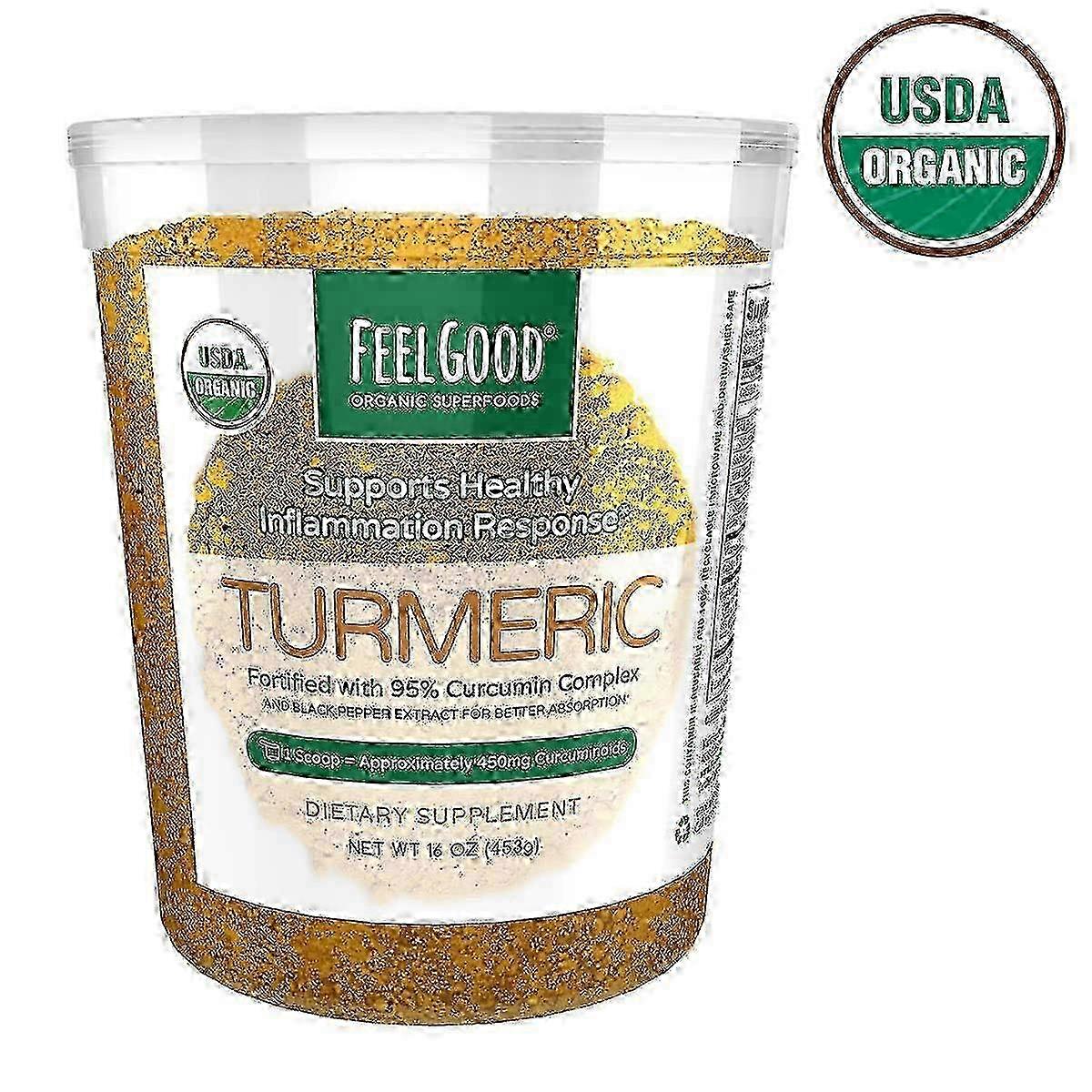 Feel Good Organic Superfoods Turmeric is a USDA certified organic root powder, fortified with 95% Curcumin Complex. Curcumin is the active ingredient in turmeric that supports a healthy inflammation response. Centuries of traditional use in Ayurvedic medicine and more than 3,500 clinical studies support its effectiveness. Turmeric supports a healthy inflammation response because of its curcuminoid compounds. Feel Good Organic Superfoods Turmeric is not only a natural source of curcumin, itâs also fortified with Curcumin Complex. This composition is standardized to contain 95% of the curcuminoids curcumin, demethoxycurcumin and bisdemethoxycurcumin.Expiration Date: We have fresh stock each week with exceptional expiration dates prior to APRIL 2024. Products will expire no later than six months to 1 year after receipt.Product Packaging: Please note that some manufacturer may often change their packaging. This product may arrive different from what is pictured. We will always ship the most up-to-date packaging to our customers. Please contact us if you have any questions about this product or would like to request an older version of this product.Healthcare Disclaimer: Content on this site is for reference purposes only. OTC Shoppe Express does not represent or warrant that the nutrition, ingredient, allergen and other product information on our Web or Mobile sites are accurate or complete, since this information comes from the product manufacturers. On occasion, manufacturers may improve or change their product formulas and update their labels. We recommend that you do not rely solely on the information presented on our Web or Mobile sites and that you review the product's label or contact the manufacturer directly if you have specific product concerns or questions. If you have specific healthcare concerns or questions about the products displayed, please contact your licensed healthcare professional for advice or answers.
