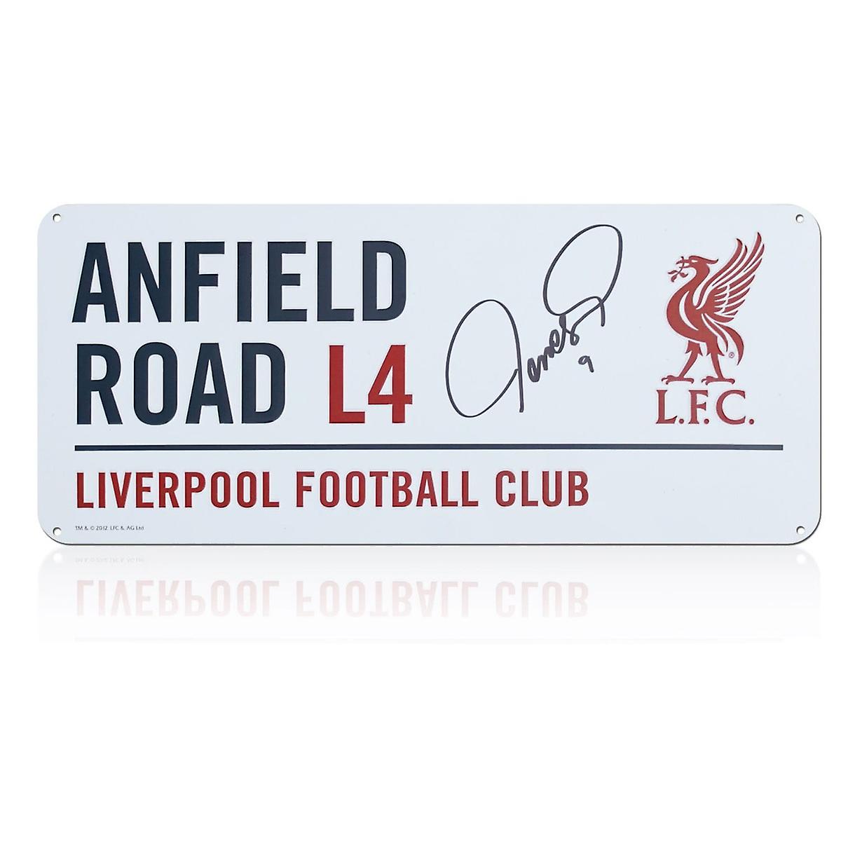 Metal Anfield Road street sign, signed by Fernando Torres. / This Anfield Road sign was signed by Fernando Torres on April 16, 2024 in Madrid. Torres scored 102 goals for Liverpool in 65 games between 2007-2011. He became the fastest player in Liverpool history to score 50 league goals. All signatures are originals they are never printed. The product image is a stock photo so the position of signatures might vary slightly. Exclusive Memorabilia unconditionally guarantees all signed items are genuine. The item will come with a certificate of authenticity featuring a numbered hologram that matches an identical hologram affixed to the product. Exclusive Memorabilia is the UK's most trusted brand of sports and entertainment memorabilia, supplying Premiership football clubs, leading cruise lines and charities with their memorabilia for sale and auction.