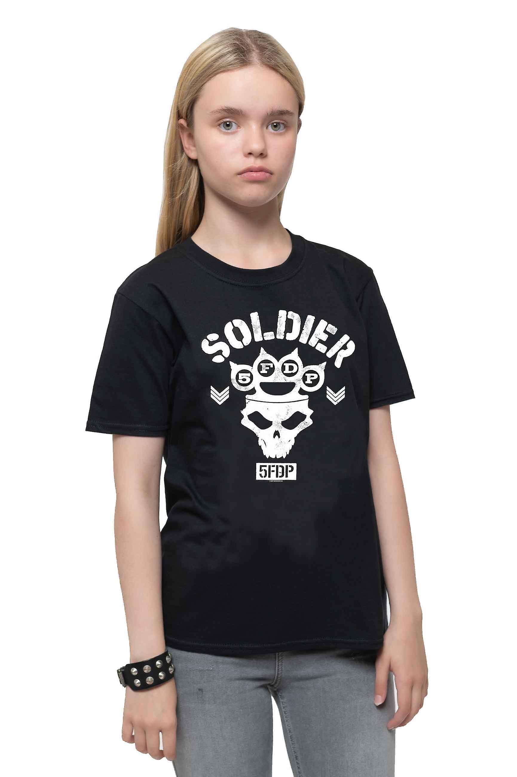 An official licensed kid's tee featuring the Five Finger Death Punch 'Soldier' design motif. This high quality t-shirt is available in a black colourway. Comes in a wide range of sizes from 5 Years through 14 Years, subject to availability.