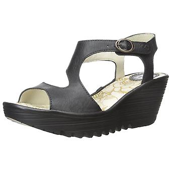 Fly london Yanca Black Womens Leather Wedge Sandals Shoes