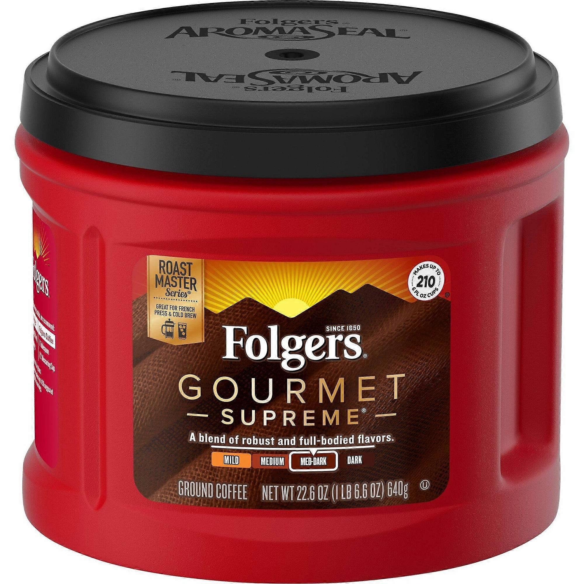 Considered our gold standard, Folgers Gourmet Supreme ground coffee is a deliciously impressive dark roast with a rich, full-bodied character. Intense and aromatic, like your coffeehouse favorite—without the price. Founded in San Francisco, Folgers is an iconic American brand with a history as rich as its coffee. For more than 150 years, Folgers has been the “Best Part of Wakin' Up" with its Mountain Grown beans and fresh, eye-opening aroma. Folgers coffee provides you with consistently rich, pure taste, cup after cup. Our great taste is equally matched by the dedication to bringing you the flavors you love in the format you choose. Some of your favorite Folgers roasts are also available in canisters, K-Cup Pods, instant, individual single serve packets and other convenient formats. UPC: 025500205366 Weight: 1.94 lbs