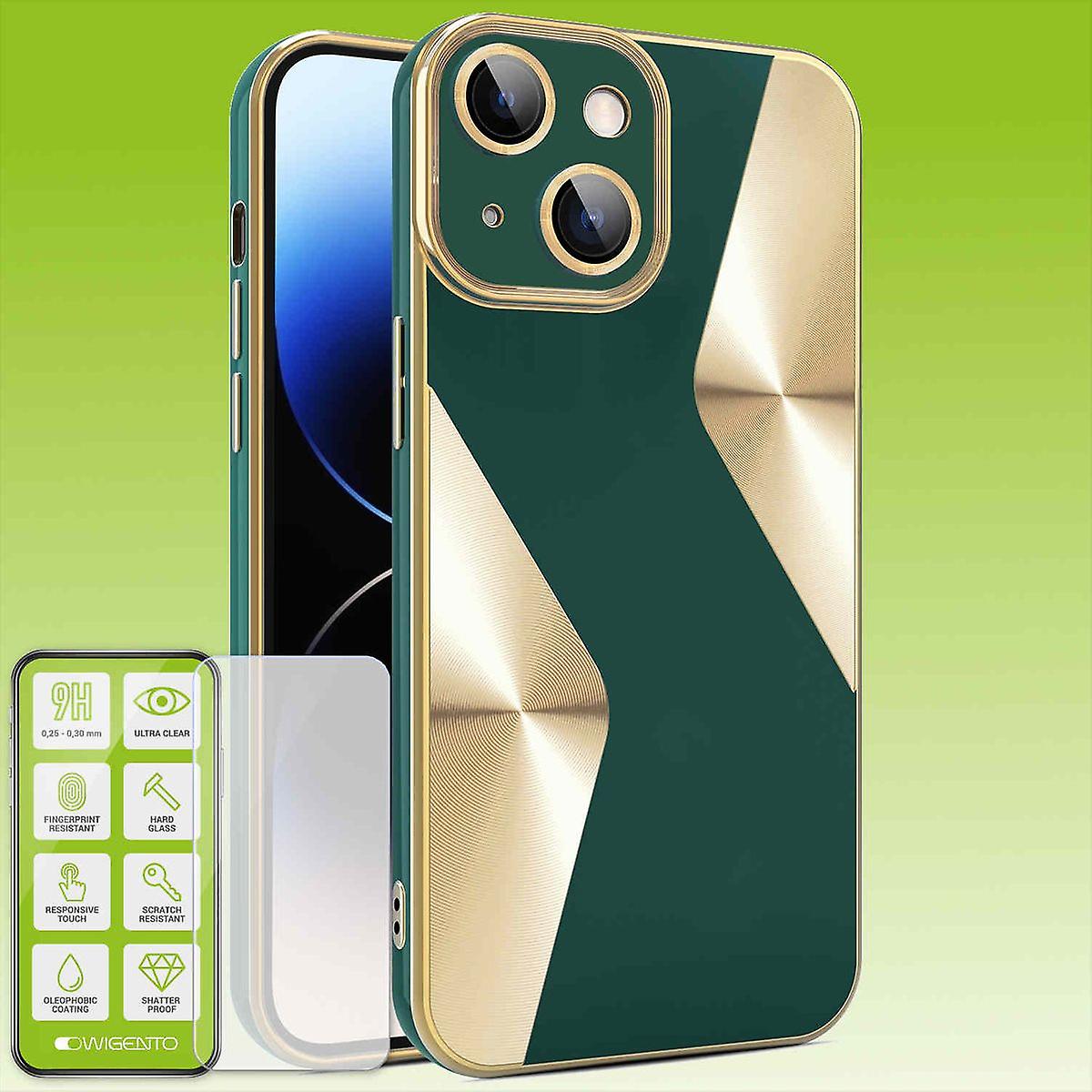 Für Apple iPhone 15 Produktset Electroplated Silikon TPU + H9 Hart Glas Schutz Hülle Case Cover Etuis Zubehör Grün