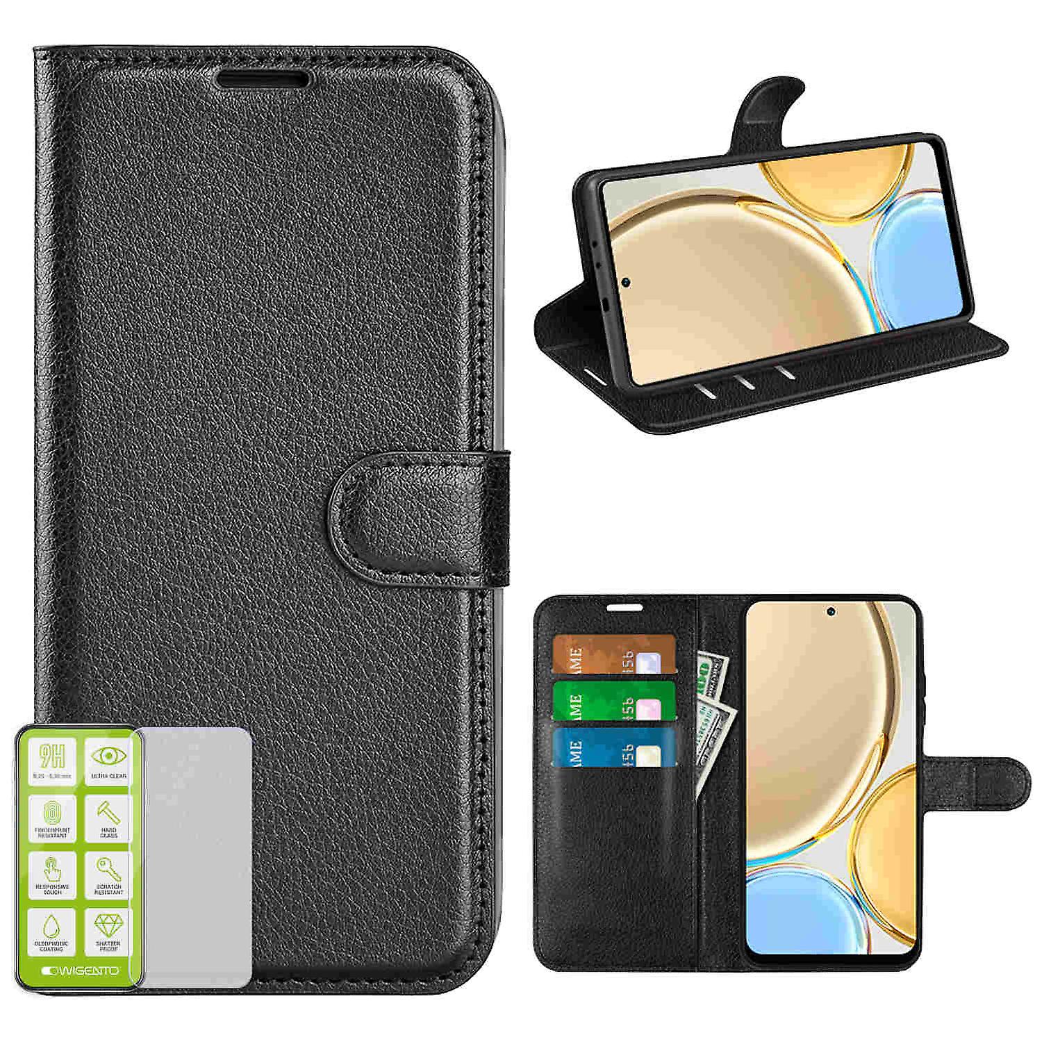 Für Honor X7b Kunst-Leder Book Wallet Handy Tasche Schwarz + Hart Glas