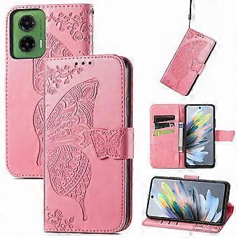 For Motorola Moto G35 Faux Leather Butterfly Phone Case Cover Pink