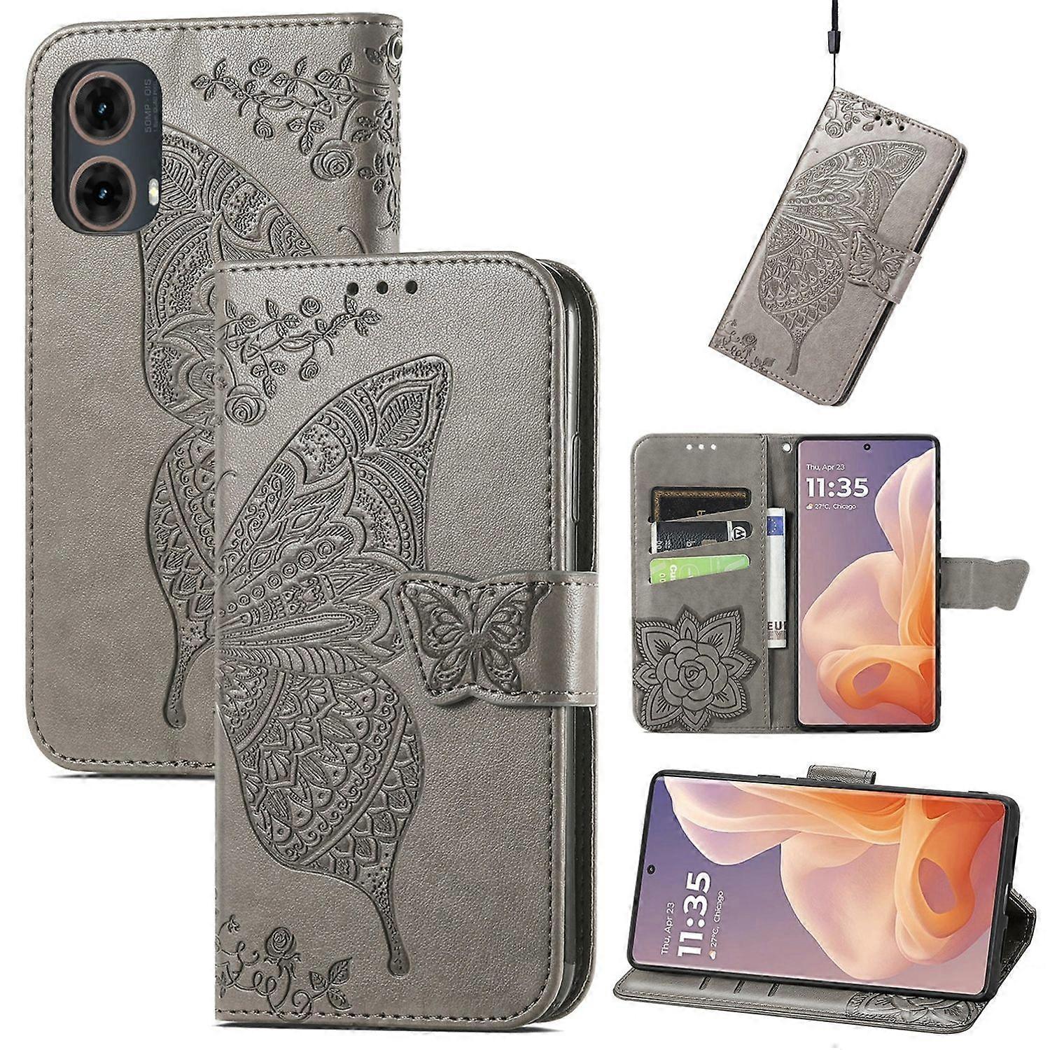 Für Motorola Moto G85 Kunstleder Schmetterling Book Wallet Hülle Grau