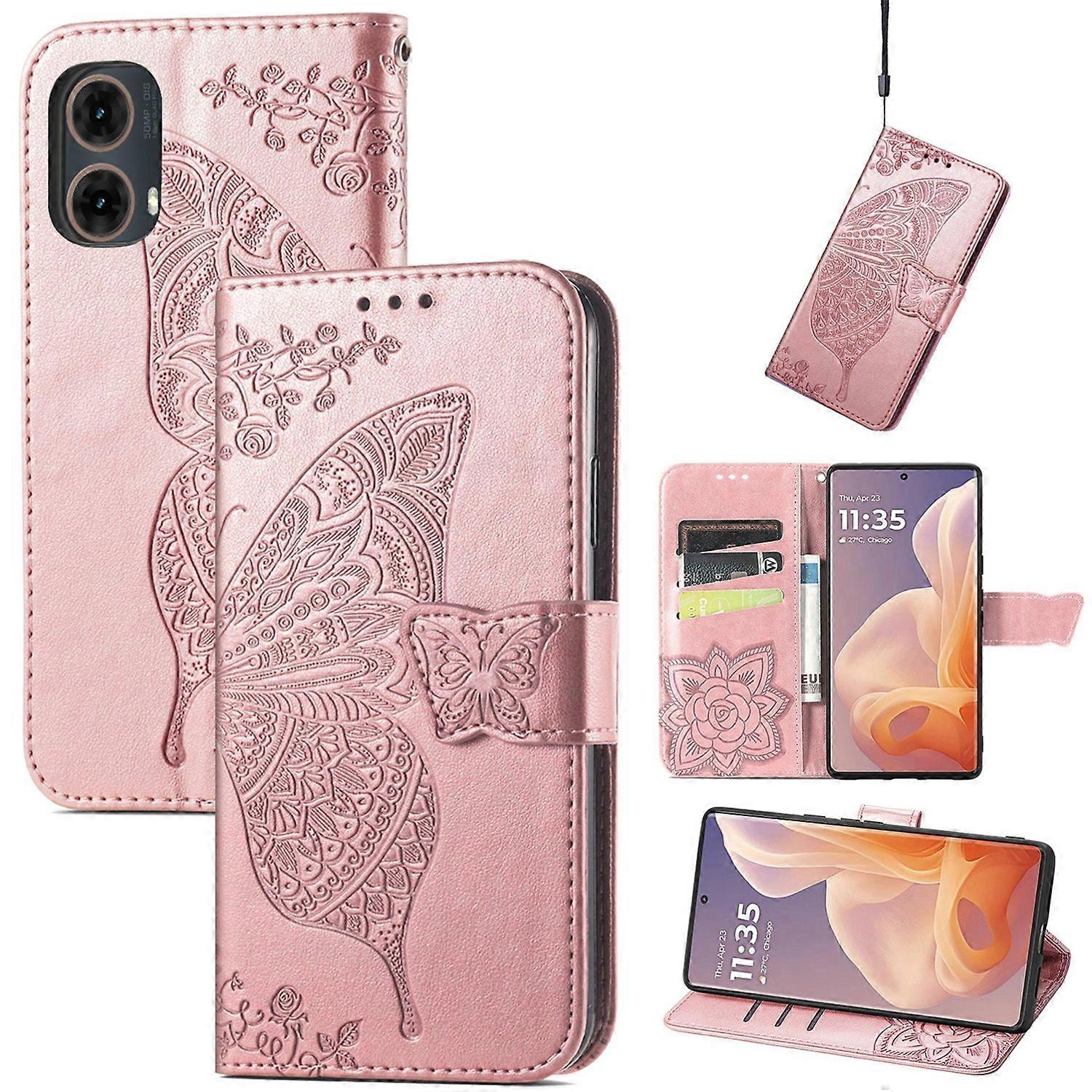 Für Motorola Moto G85 Kunstleder Schmetterling Book Wallet Hülle Rosa