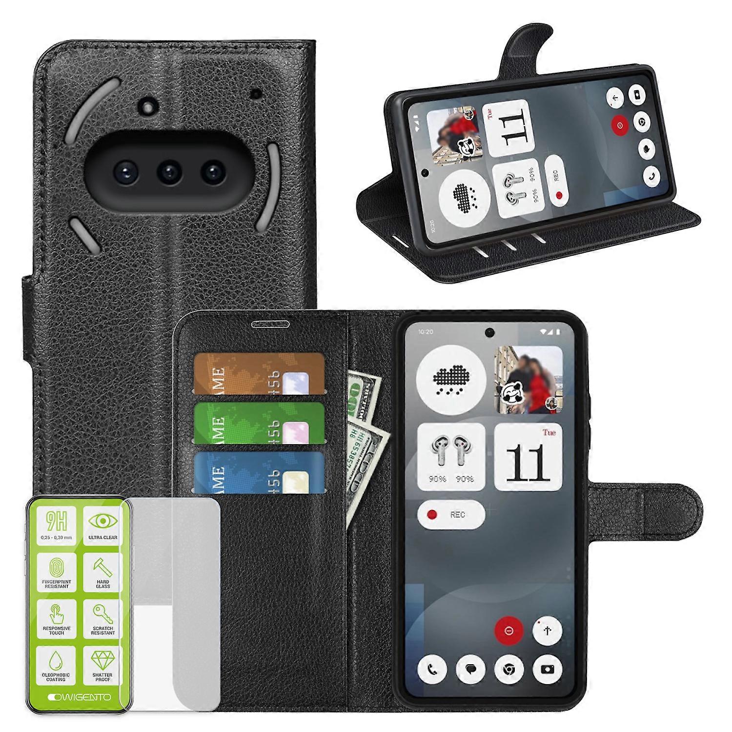 Für Nothing Phone 3a Kunstleder Wallet Tasche Schwarz + 9H Hart Glas