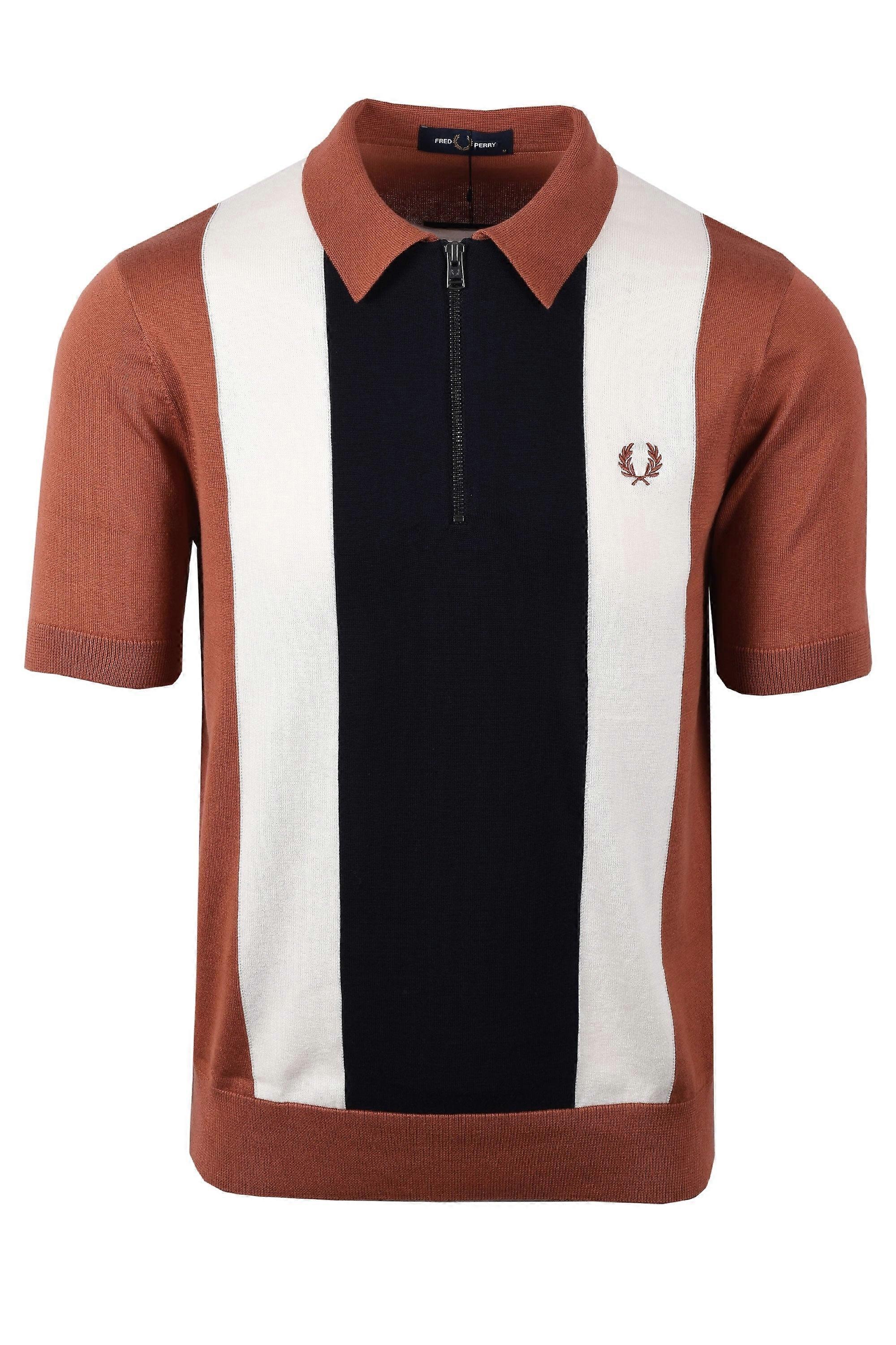 Fred Perry Vertical Stripe Zip Neck Polo Cinnamon/Navy/Ecru 100% cotton knitted polo that boasts a true retro stripe detailing for that classic vintage vibe. The zip neck adds a touch of modern design and the knitted laurel wreath is a classy branded detail. 100% cotton Regular Fit Style - K9728