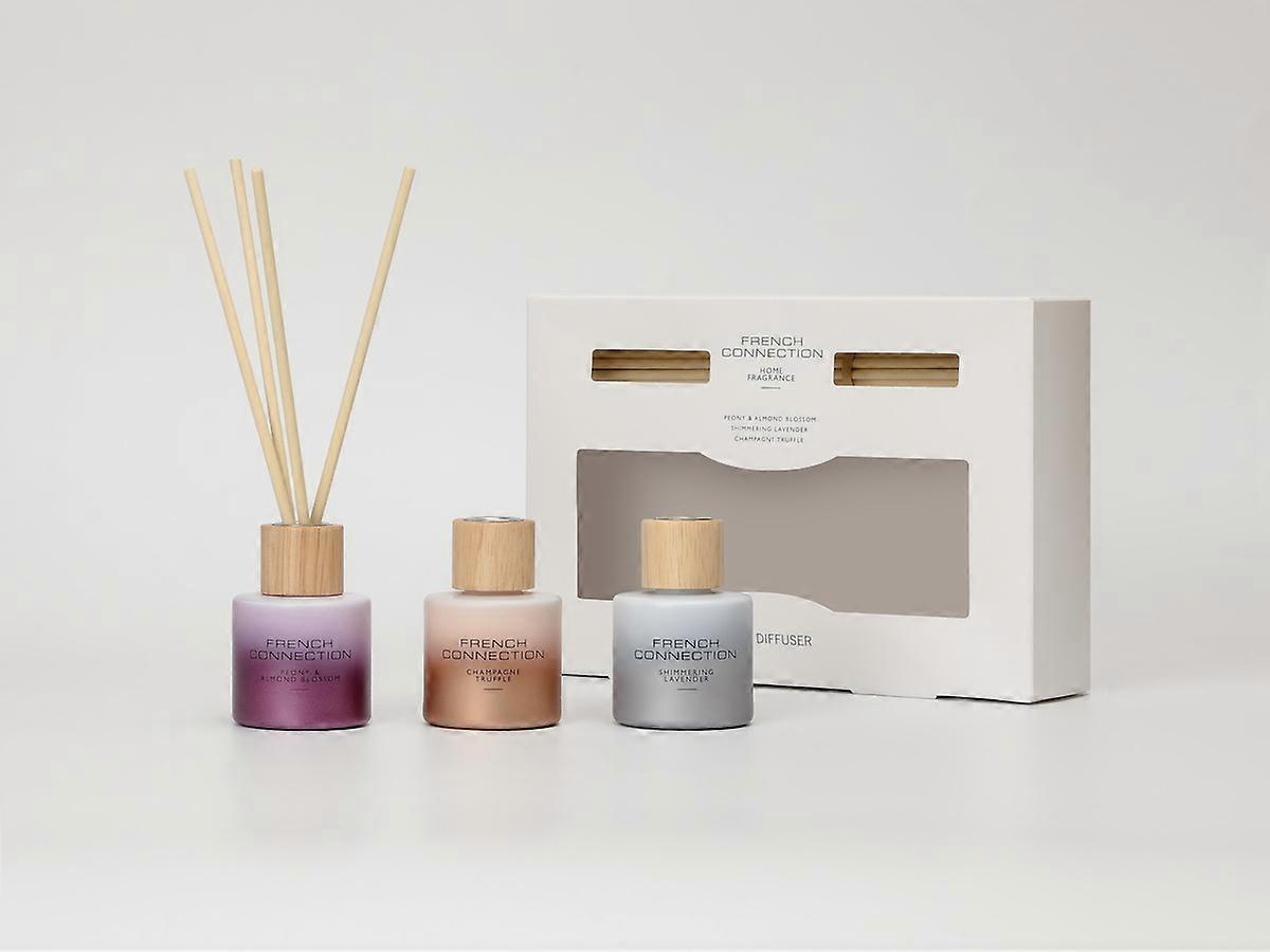 Make your home look and smell incredible with the exquisite French Connection [/french-connection.html] Ombre Reed Diffuser Gift Set, featuring three stunningly designed diffusers in Peony & Almond Blossom, Shimmering Lavender, and Champagne Truffle. Gift boxed to perfection, each diffuser incorporates premium fragrance oils with natural reeds to deliver long-lasting, elegant scents that will fill any room with a sense of warmth and relaxation. This gift set features beautiful ombré glass bottles with wooden caps, this set makes the perfect new home gift, birthdays, or a self care gift. These reed diffusers will look amazing placed in your living room, bedroom, or bathroom, a lovely touch of luxury for any room. Treat yourself or a loved one to the ultimate home fragrance experience with these luxury French Connection reed diffusers. Explore our wide range of home fragrance accessorie [/home-fragrance.html]s on our website today.