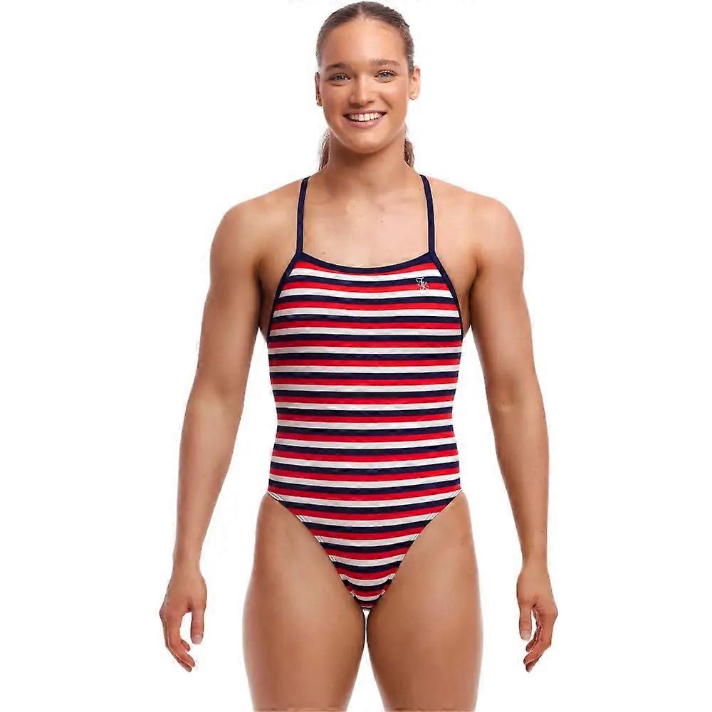 FEATURES 100% chlorine resistant Adjustable single bind shoulder straps High leg height ECO C-Infinity fabric - made from recycled polyester 100% polyester The Riviera Tie Me Tight Swimsuit from Funkita is giving South of France sunny vibes with its French navy, red and white stripes and French navy binding straps. The thin single bind straps, can be tied at the back, giving you the flexibility to adjust the fit of the swimsuit. The cross straps and high leg give greater freedom of movement for your swimming or training sessions. This swimsuit is made from durable ECO C-Infinity fabric and provides high chlorine resistance, shape and colour retention.