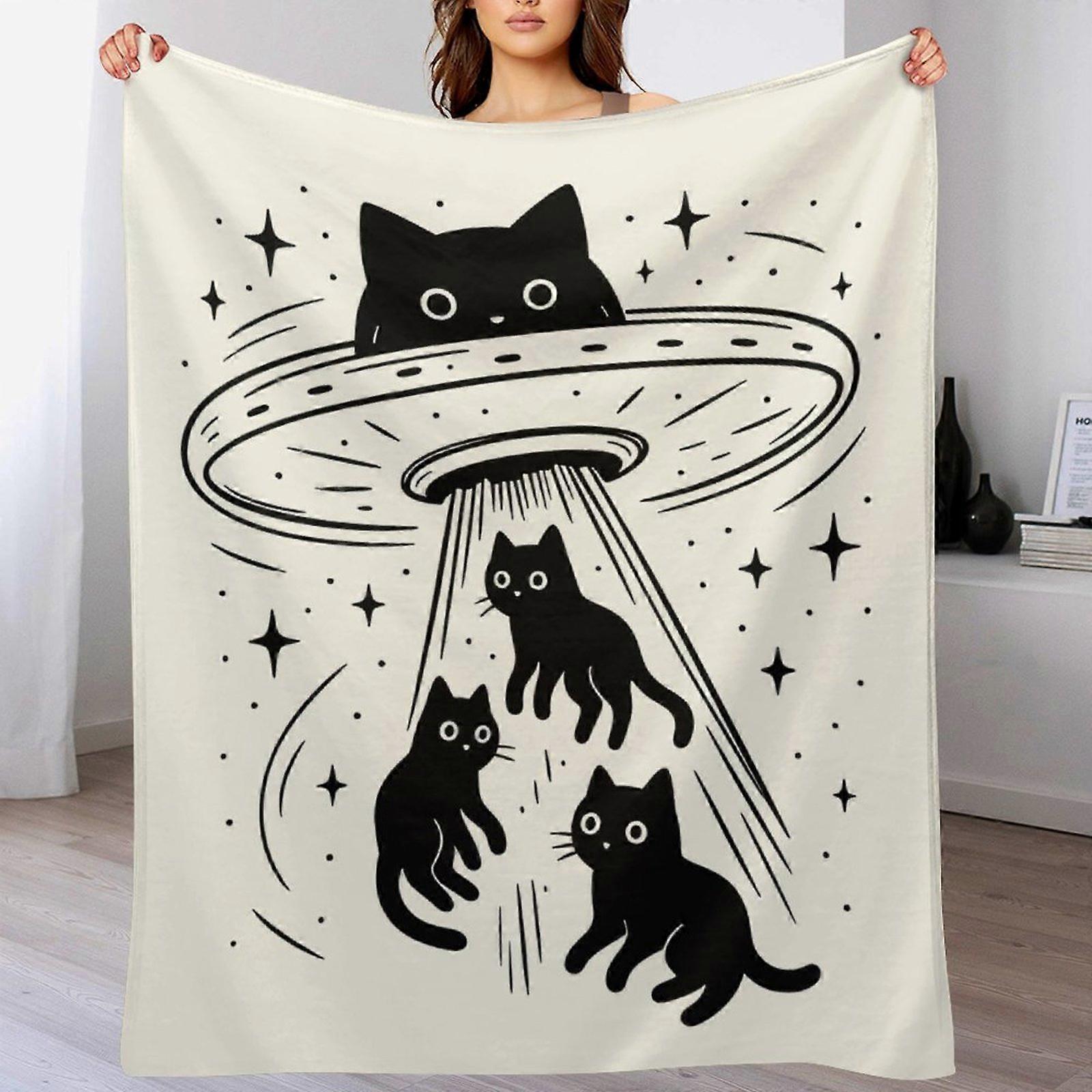 Funny Alien Cat UFO Graphic Print Fleece Blanket, Black Cat Abduction Illustration Soft Cozy Throw for Sofa Bed Bedroom Home Decor, Unisex Adults