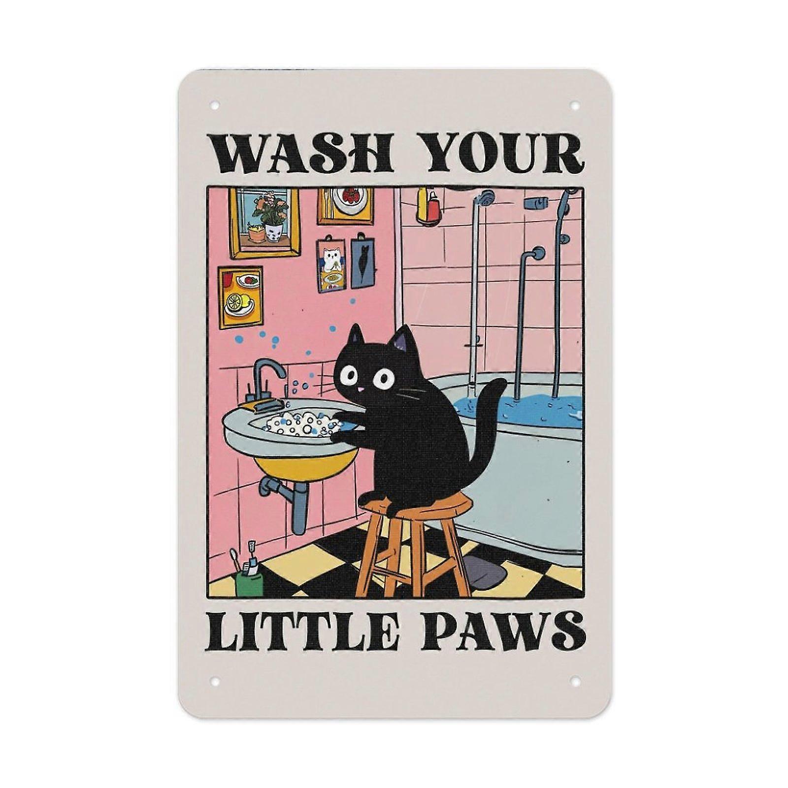 Funny Black Cat Bathroom Metal Tin Sign, Cute Wash Your Little Paws Cartoon Wall Decor for Bathroom Kitchen, Animal Humor Gift