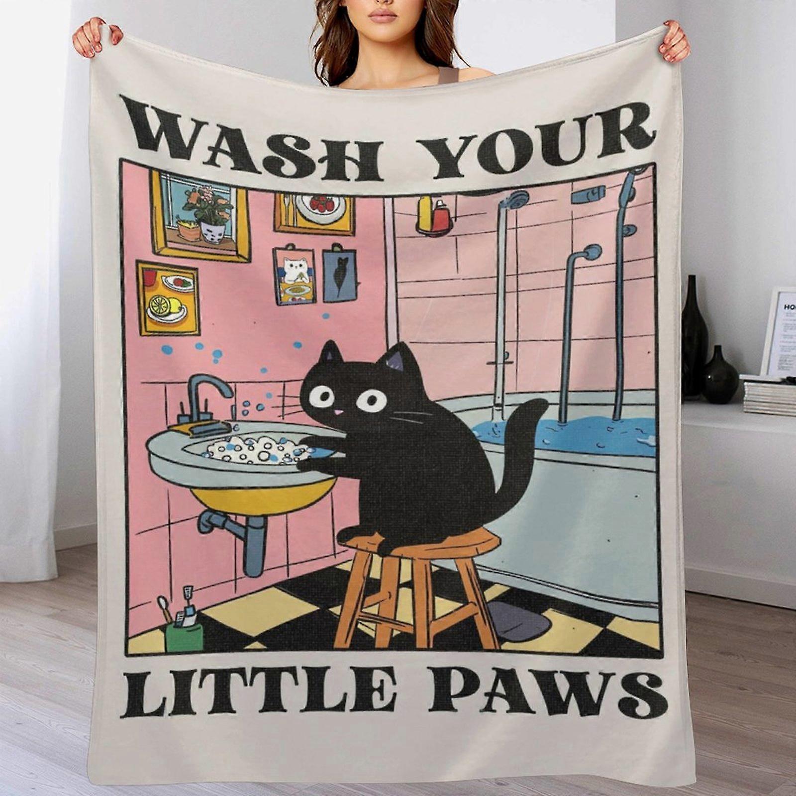 Funny Cartoon Black Cat “Wash Your Little Paws” Letter Graphic Fleece Blanket, Soft Warm Cozy Throw for Sofa Bed Bedroom Bathroom Decor, Unisex Adults