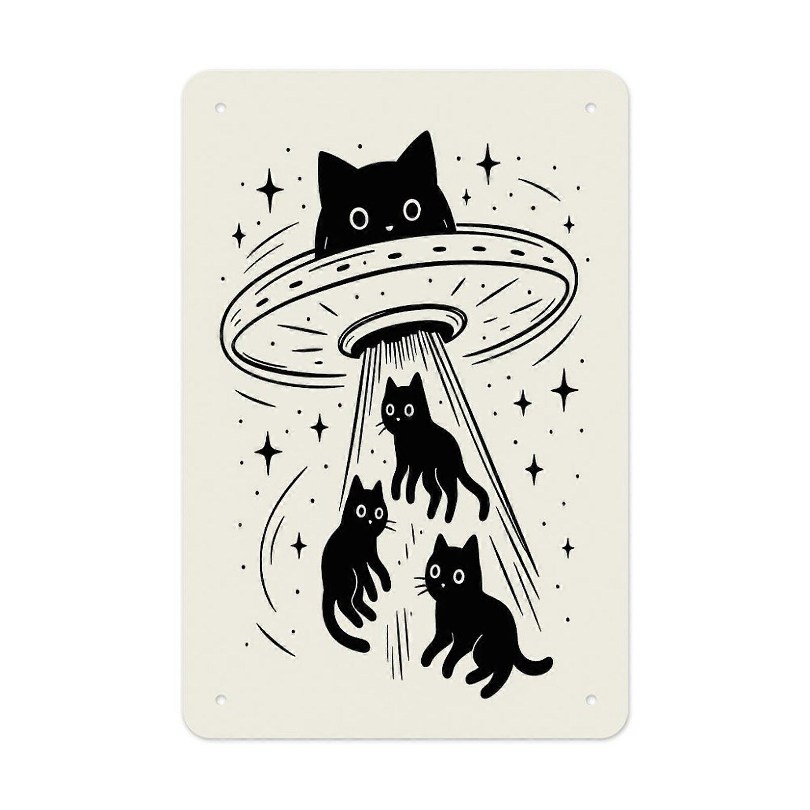 Funny UFO Cat Abduction Graphic Tin Sign Metal Wall Art Cute Cartoon Home Decor