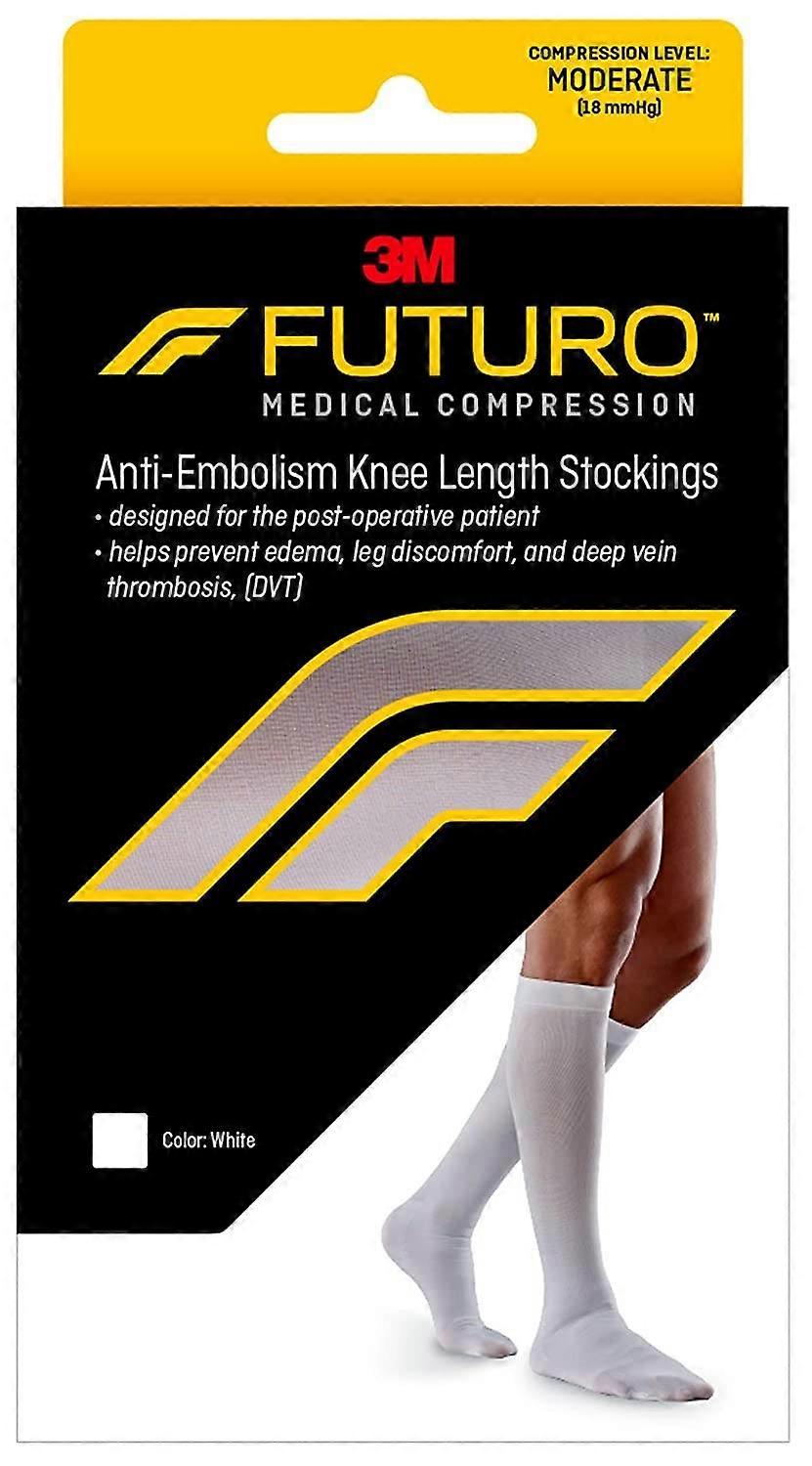 Designed for the post-operative patient Helps prevent edema, leg discomfort Latex free materials Designed for the post-operative patient Helps prevent edema, leg discomfort and deep vein thrombosis (DVT) Latex free materials Graduated Compression Anti-Embolism Benefits: Graduated compression speeds blood flow by providing the most compression at the ankle and gradually diminishing prssure up the calf. Helps reduce the formation of blood clots. Soft, durable materials for outstanding comfort and fit. Futuro guarantees its products to be of the highest quality. If you should receive a defective product, please wash and return for replacement or full replacement value. Futuro guarantees its products to be of the highest quality. If you should receive a defective product, please wash and return for replacement or full replacement value. Fitting Futuro Stockings: Measure around the circumference of calf at the widest point to determine "size". Measure distance from bend of knee to bottom of heel (in standing position, if possible) to determine "length". Futuro Stocking Precautions: Proper sizing and application must be assured. Sizing Chart: Medium Regular 13 1/2" to 17" Long x 12" to 15" in circumference. Large Regular 13 1/2" to 18" Long x 15" to 17 1/2" in circumference. X-Large Regular 13 1/2" to 18" Long x 17 1/2" to 20" in circumference. UPC: 051131201620 Weight: 0.75 lbs