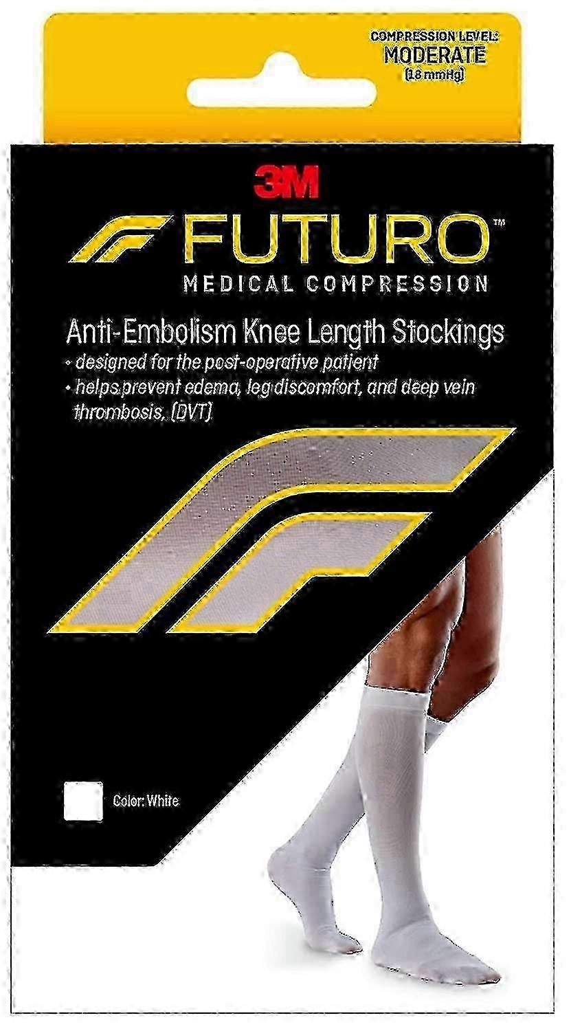 Designed for the post-operative patient Helps prevent edema, leg discomfort Latex free materials Designed for the post-operative patient Helps prevent edema, leg discomfort and deep vein thrombosis (DVT) Latex free materials Graduated Compression Anti-Embolism Benefits: Graduated compression speeds blood flow by providing the most compression at the ankle and gradually diminishing prssure up the calf. Helps reduce the formation of blood clots. Soft, durable materials for outstanding comfort and fit. Futuro guarantees its products to be of the highest quality. If you should receive a defective product, please wash and return for replacement or full replacement value.Futuro guarantees its products to be of the highest quality. If you should receive a defective product, please wash and return for replacement or full replacement value.Fitting Futuro Stockings: Measure around the circumference of calf at the widest point to determine "size". Measure distance from bend of knee to bottom of heel (in standing position, if possible) to determine "length". Futuro Stocking Precautions: Proper sizing and application must be assured. Sizing Chart: