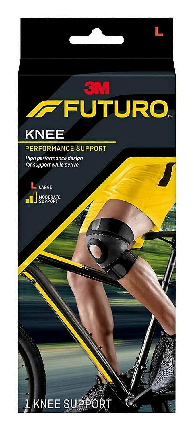 New and Improved. Moisture releasing technology Polartec: Power Stretch-Rx High performance design for active support Dual precision straps for customer fit Support your active life Antimicrobial treatment of odor control Designed to help prevent re-injury Keeps joint warm and limber Fits right or left knee Features: Breathable, moisture wicking Polartec Power Stretch-Rx in back panel for comfort Contoured design with dual precision straps for anatomical fit Antimicrobial treatment inhibits odor-causing micro-organisms Strong, durable materials help provide stability Open patella for support and comfort of kneecap Usage: This Futuro Sport Open Patella Knee Support provides support to stiff, weak, or injured knees. A unique combination of neoprene and Polartec Power Stretch-Rx materials keeps the knee warm & limber while releasing excess heat and moisture. The contoured design & dual precision straps will help keep the support in place during sport or other vigorous activities. Size: For left of right leg, measure around kneecap while in a standing position: Small - 130 - 15. 0 in (33. 0 - 38. 0 cm) Medium - 15. 0 - 17. 0 in (38. 0 - 43. 0 cm) Large - 17. 0 - 19. 0 in (43. 0 - 48. 0 cm) Developed in collaboration with a panel of physicians, surgeons and medical specialists. Futuro offers a wide range of high quality products. Each is designed to offer optimal support, comfort and fit. Futuro guarantees its products to be of the highest quality. If you should receive a defective product, please wash and return it for replacement or full replacement value. Suggested Use: Open all closures and slide over foot, with widest opening at top. Position open patella hole over kneecap Secure top strap along top edge of support Secure bottom strap along bottom edge of support. Tighten both straps until fit is snug, yet comfortable Care: Close fasteners before washing. Hand wash with mild soap in warm (not hot) water. Rinse well and air dry. Do Not: machine wash, tumble dry, dry clean or use bleach or fabric softeners. UPC: 051131201385 Weight: 0.88 lbs