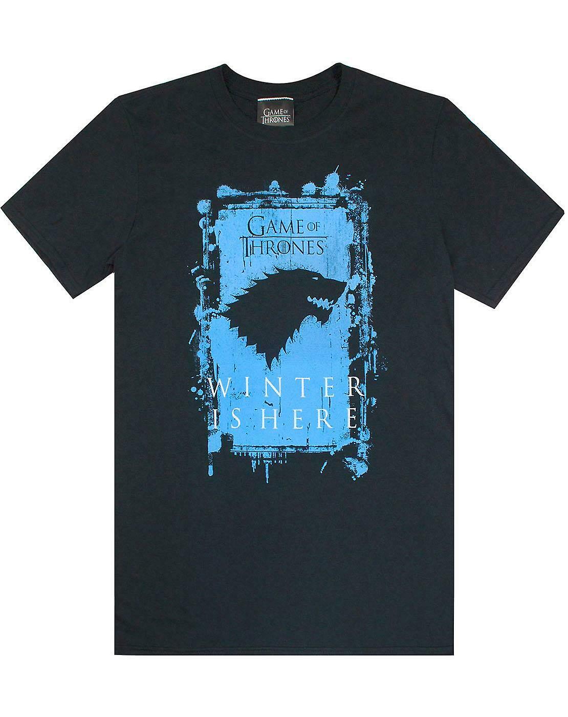 Get ready for winter with this Game Of Thrones Winter Is Here Men's T-Shirt, the perfect addition to any fan's wardrobe, especially for this penultimate season of the hit TV series. The design sees a cool blue metallic look paint effect with the classic Game of Thrones logo, the Stark house direwolf, and the 'Winter is Here' slogan. This bold print sits against the black t-shirt, contrasting perfectly. This t-shirt is a crew neck and short sleeves combo while offering a men's standard fitting. To get the most out of your product, please follow all care instructions carefully. This t-shirt is fully licensed and branded throughout.