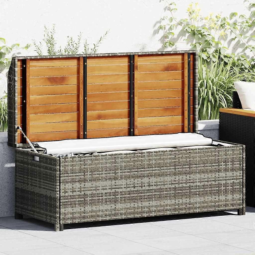 Suchen Sie eine attraktive und vielseitige Aufbewahrungslösung für den Außenbereich? Dann ist diese Sitzbank mit Stauraum aus Poly-Rattan die ideale Wahl für Sie Sie ist mit einem geräumigen Stauraum ausgestattet und bietet Platz für Gartenartikel, Gartenmöbel-Kissen, Auflagen, Plaids, Pool- und Gartenbedarf. Diese Garten-Sitzbank besteht aus Poly-Rattan, Akazienholzlatten und Stahlrahmen, was Langlebigkeit und Wetterbeständigkeit sowie jahrelangen, zuverlässigen Dienst gewährleistet. Die Bank verfügt über eine Innentasche, die den Inhalt vor Staub und Feuchtigkeit schützt. Dank der erhöhten Füße sorgt diese Gartenbank für eine gute Luftzirkulation und hält den Inhalt trocken und sauber. Zudem ist sie leicht mit einem feuchten Tuch sauber zu halten. Die Garten-Aufbewahrungsbank ist einfach zu montieren. Hinweis: Bitte decken Sie die Auflagenbox mit wasserdichtem Stoff/Material ab, damit bei Regen kein Wasser in die Box eindringt. Farbe: GrauMaterial: Poly Rattan, massives Akazienholz mit Ölfinish, StahlAbmessungen: 120 x 50 x 50 cm (L x B x H)Erhöhte SeitenkanteMit PE-InnenfutterMit Haltegriffen auf beiden Seiten