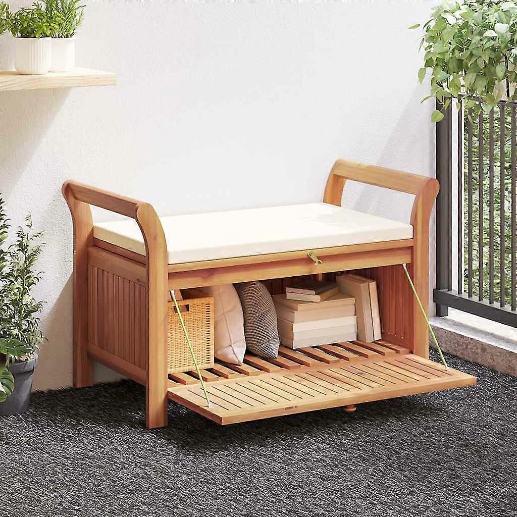 Diese stilvolle und praktische Gartenbank aus Holz wird ein echter Blickfang in deinem Garten sein Langlebiges Material: Massives Akazienholz ist ein schönes Naturmaterial. Akazienholz ist ein tropisches Hartholz, das dicht, robust und langlebig ist.Viel Stauraum: Das Möbelstück stellt auch Stauraum zur Verfügung, um leichter für Ordnung zu sorgen. Darin lassen sich Kissen, Auflagen, Decken, Spielzeug und andere Sachen verstauen.Geschwungene Armlehnen: Dank der geschwungenen Armlehnen bietet die Bank mit Stauraum nicht nur viel Komfort, sondern lässt sich auch einfach umstellen.Bequemes Sitzerlebnis: Das mitgelieferte, zusätzliche Sitzkissen bietet höchsten Komfort. Gut zu wissen:Um die Montage so einfach wie möglich zu machen, wird jedes Produkt mit einer Anleitung geliefert. Hinweis:Damit deine Gartenmöbel lange schön bleiben, empfehlen wir dir, sie mit einer wasserdichten Hülle zu schützen. Sitzbank mit Stauraum: Material: Akazien-Massivholz, mit Öl behandeltAbmessungen: 91 x 50 x 60 cm (L x B x H)Sitzhöhe vom Boden: 43 cmMaximale Belastbarkeit: 110 kgSitzkissen:Farbe: CremeweißBezugsmaterial: Stoff (100% Polyester)Polsterung: SchaumstoffAbmessungen: 73 x 50 x 4 cm (L x B x H)Lieferung umfasst:1 x Truhenbank1 x Sitzkissen