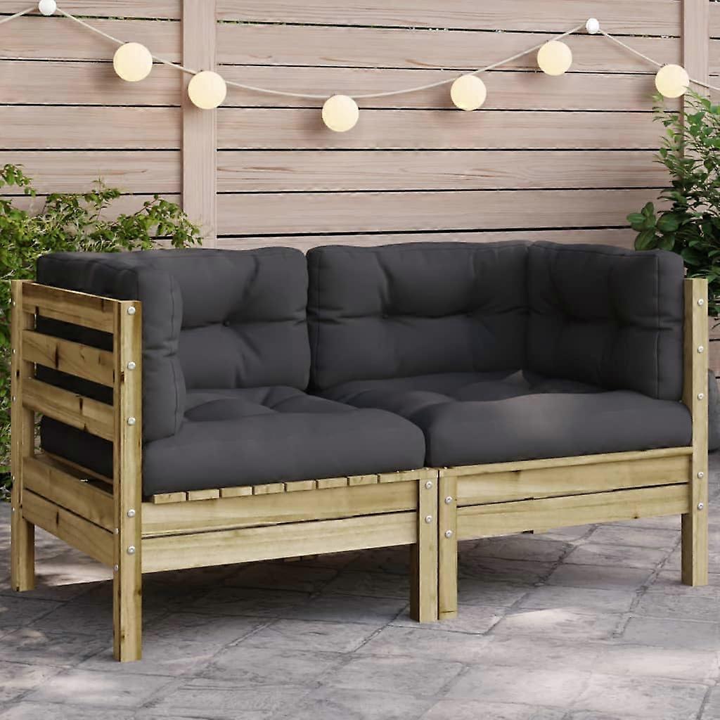 Dieses Gartensofa aus Holz mit Kissen ist eine großartige Ergänzung für deinen Garten, deine Terrasse oder deinen Innenhof, um mit Familie und Freunden zu plaudern oder einfach nur das Wetter zu genießen. Imprägniertes Holz: Massives Kiefernholz ist ein wunderschönes Naturmaterial. Kiefernholz weist eine gerade Maserung auf und die Aststellen verleihen dem Material seine charakteristische, rustikale Optik. Die Imprägnierung ist ein Konservierungsprozess, der unter Verwendung von Autoklaven durchgeführt wird. Die Druckbehandlung erhöht die Widerstandskraft gegen Verrottung und Witterung.Bequemes Sitzerlebnis: Die Rückenlehne und die dick gepolsterten Kissen bieten höchsten Sitzkomfort.Latten-Design: Das Latten-Design verhindert effektiv die Ansammlung von Wasser, sodass die Sitzfläche trocken bleibt und Holzfäule verhindert wird.Modulares Design: Dieses modulare Sofa ist völlig flexibel und leicht umzustellen, um sich an jede Umgebung anzupassen. Du kannst das Modulsofa mit anderen modularen Sofaelementen kombinieren, die im Dropdown-Menü zur Auswahl stehen, um dein persönliches Outdoor-Lounge-Set nach Belieben zu erstellen