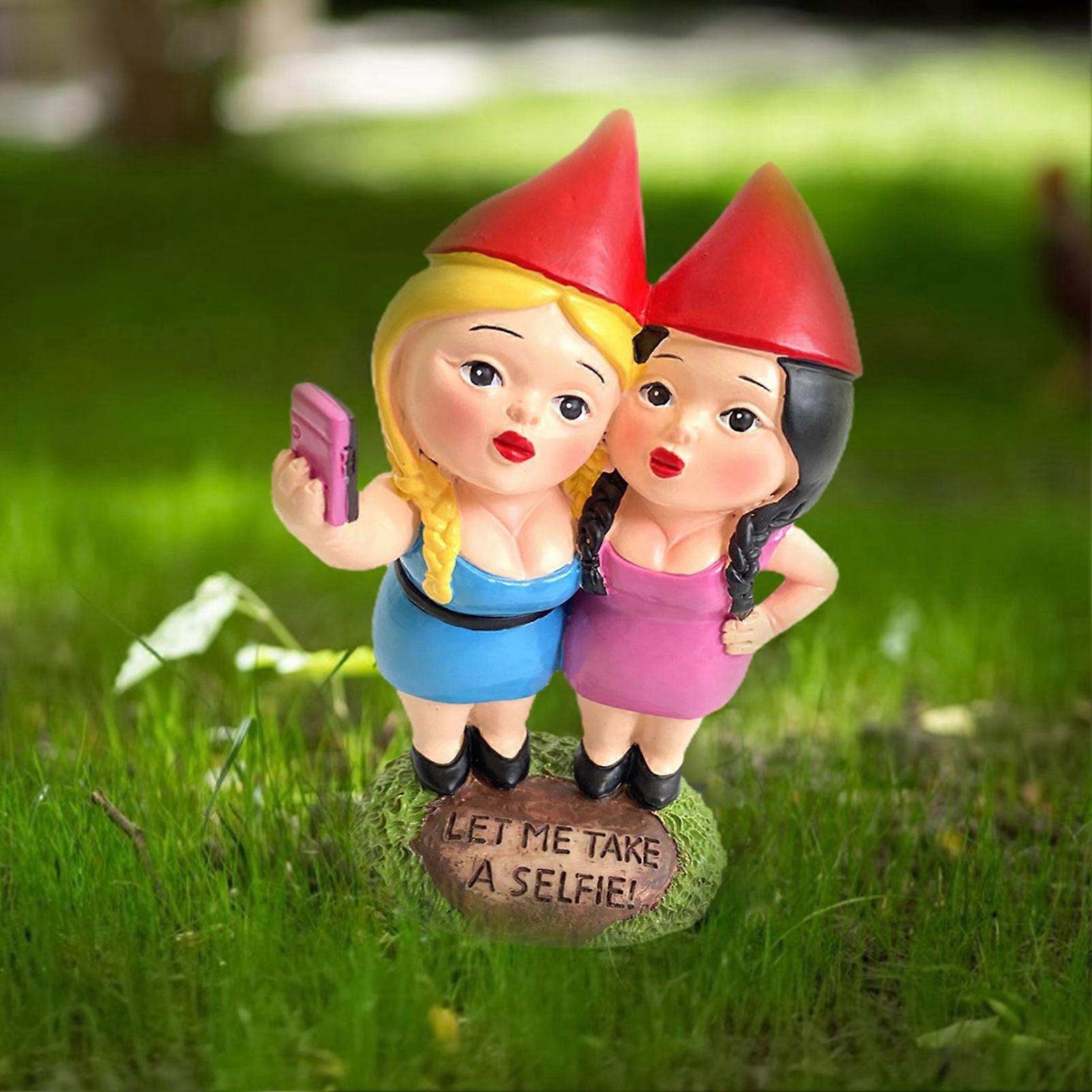 Garden Gnome Garden Statue Sister Taking Selfie Christmas Decorations Small Sculpture for Household Fairy Miniature Garden Lawn
