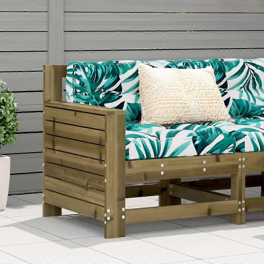 Dieses Gartensofa aus Holz mit Kissen ist eine großartige Ergänzung für deinen Garten, deine Terrasse oder deinen Innenhof. Auf diesem Gartenmöbel kannst du mit Familie und Freunden plaudern oder einfach nur das Wetter genießen. Imprägniertes Kiefernholz: Die Kesseldruckimprägnierung ist ein Konservierungsverfahren, das mit Hilfe von Autoklaven durchgeführt wird. Sie erhöht die Resistenz gegen Fäulnis und Witterung.Bequemes Sitzerlebnis: Die Rückenlehne und die Kissen bieten höchsten Sitzkomfort.Latten-Design: Das Latten-Design verhindert die Ansammlung von Wasser auf dem Gartenstuhl, hält die Sitzfläche trocken und verhindert Verrottung.Modulares Design: Das modulare Sofa lässt sich flexibel und einfach umstellen. Du kannst es mit anderen modularen Sofa-Elementen kombinieren, die im Dropdown-Menü zur Auswahl stehen, um dein persönliches Outdoor-Lounge-Set nach Belieben zu erstellen Breite Anwendungen: Die Gartensessel eignet sich perfekt für jede Veranda, Terrasse, jeden Hinterhof, Rasen, Garten, usw. Gut zu wissen:Wir empfehlen dir, deine Gartenmöbel mit einer wasserdichten Hülle zu schützen, um lange Zeit eine ansprechende Optik aufzuweisen. Material: Kesseldruckimprägniertes KiefernholzAbmessungen: 69 x 62 x 70,5 cm (B x T x H)Sitzhöhe vom Boden: 32 cmArmlehnenhöhe vom Boden: 52 cmKissenfarbe: BlattgrünZusammenbau erforderlich: JaLieferung umfasst:1 x Gartensessel1 x Sitzpolster1 x Rückenkissen