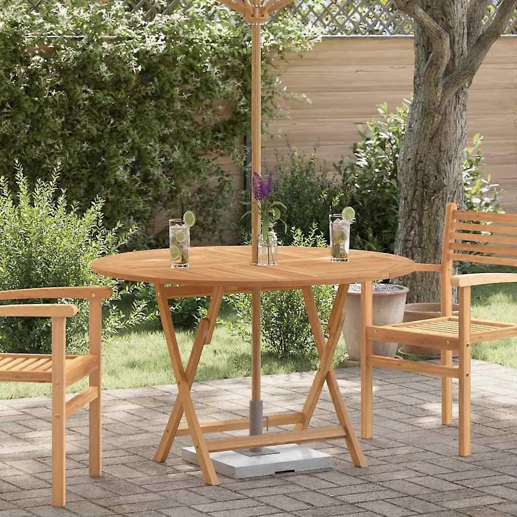 Material: Massives Teakholz mit Lasur auf WasserbasisMaße: 110 x 75 cm (Durchmesser x H)Durchmesser des Sonnenschirmlochs: 5 cmWitterungsbeständigZusammenbau erforderlich: Ja
