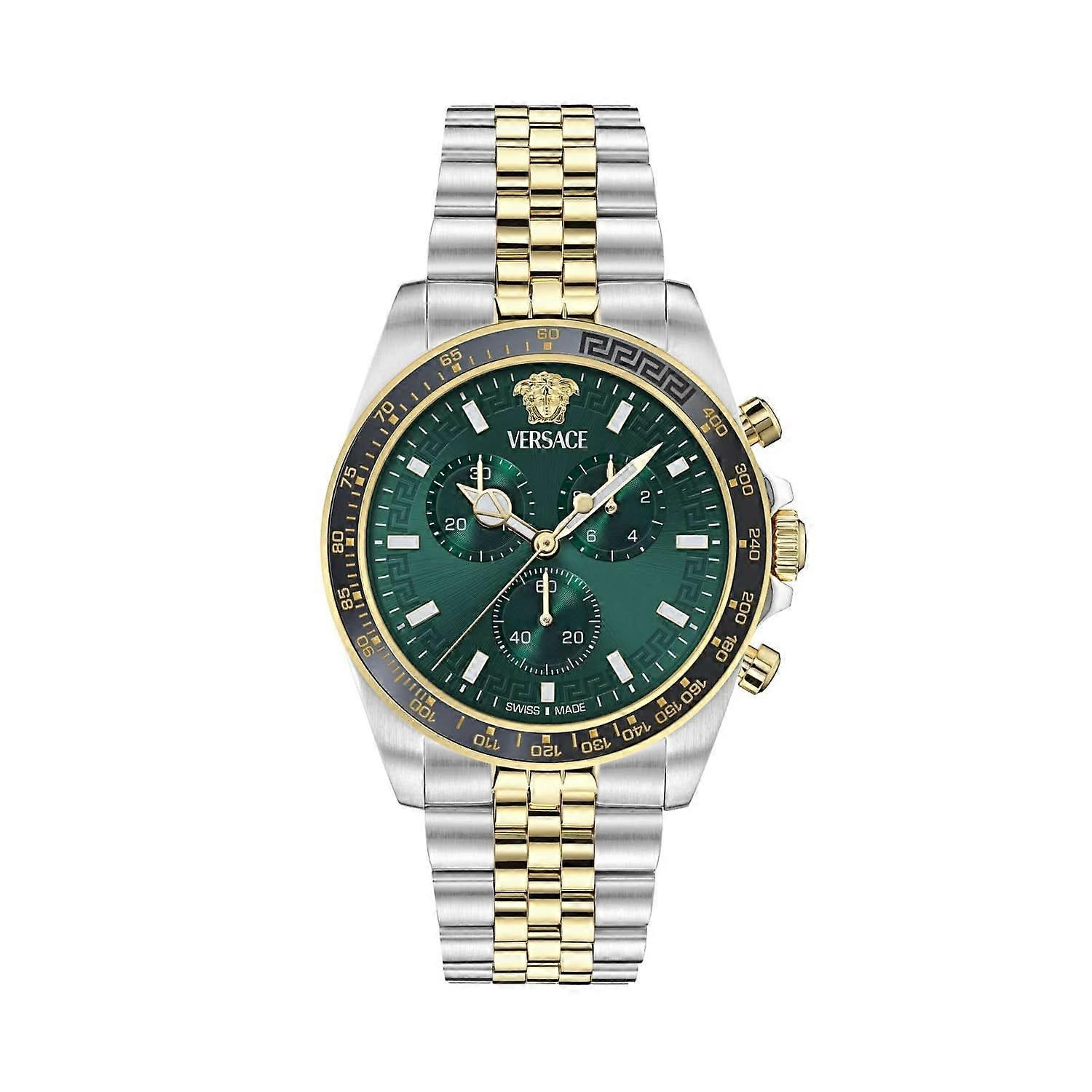 Gents Greca Chr Wave Green Watch VE0H00425 Introducing the "Greca Chrono Wave" by Versace, a bold masculine timepiece designed for the modern gentleman. With its sleek 43mm case and precise chrono movement, it exudes confidence and functionality. Featuring Arabic numbers as indexes and a top ring adorned with bold Greek motifs and tachymeter numbers, it seamlessly blends sporty aesthetics with Versace's distinctive DNA. Case Material - Stainless Steel Case Colour - Stainless Steel Case Shape - Round Case Dimensions - 43 mm Case Thickness - 11.25 mm Lens Glass - Sapphire Dial Colour - Green Attachment Buckle/Clasp Material - Stainless Steel Strap Material - Stainless Steel Strap Colour - SS & Yellow Gold Tone Strap Band Width (mm) - 23 mm Strap Length - 173.