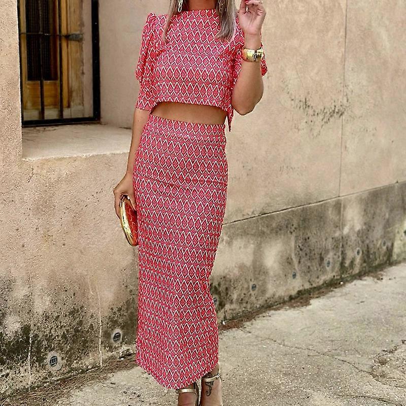 Geometry Print Puff Sleeve Top & Dress Set - O Neck Backless Evening Outfit 2pc