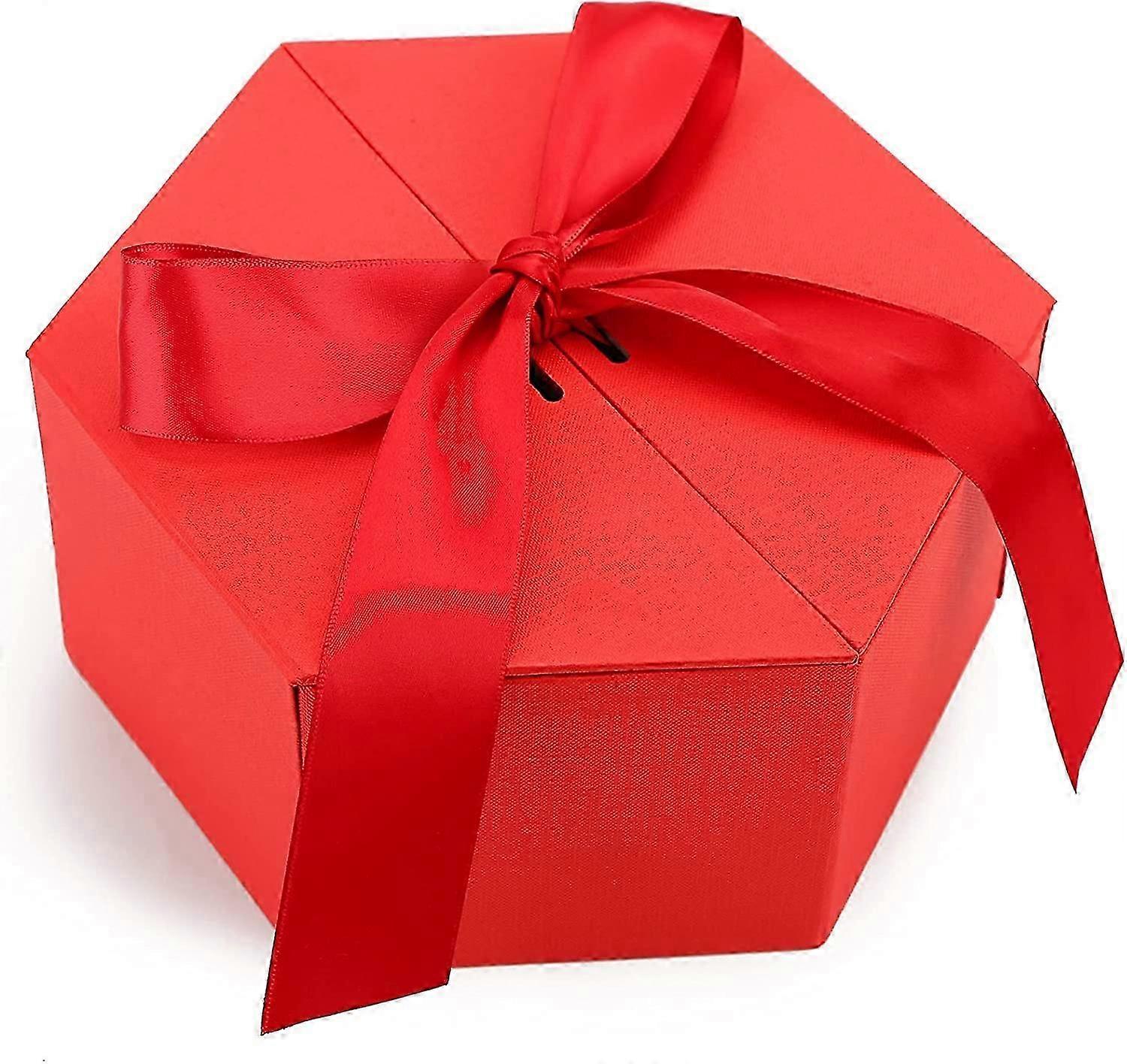 Gift box, hexagonal box large red gift box with lid ribbon and lid, large Christmas box that can hold gifts.