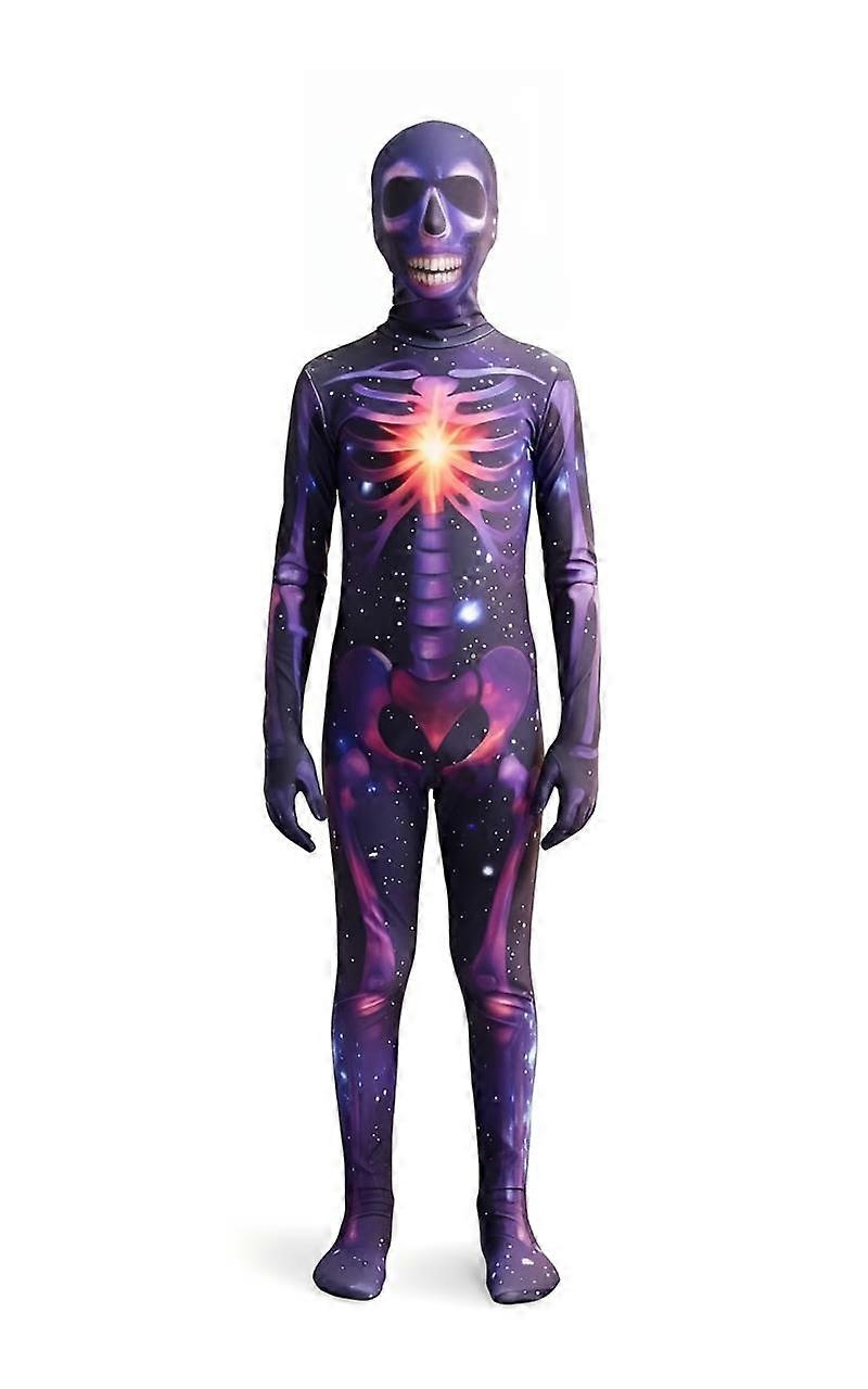 GALACTIC SKELETON DESIGN:Step into the stars with this cosmic skeleton costume featuring a vivid galaxy print and glowing ribcage effect. Perfect for Halloween parties, fancy dress events, or themed school days, this striking outfit will make your child stand out in any spooky crowd.COMFORTABLE & STRETCHY FABRIC:Made from soft, breathable 90% polyester and 10% Lycra fabric, this bodysuit offers full flexibility and comfort. Comes complete with a matching stretch mask that enhances the spooky skeleton look. Easy to wear and remove, making dressing up simple for kids.EASY ZIP & VELCRO CLOSURE:Designed for convenience, the back zip fastening ensures quick dressing and removal, while the hood features secure velcro closure for easy adjustment. Ideal for active kids who love effortless costume fun without compromising on comfort.SAFE & CE/UKCA CERTIFIED:This Clown Costume fancy dress is CE/UKCA certified and made with child safety in mind. Suitable for children aged 3 years and above. Please note: not suitable for children under 36 months due to small parts that may present a choking hazard. Always wear under adult supervision.PERFECT GIFT IDEA:Available in sizes 3–5, 6–8, 9–11, and 12–14 years, this glowing cosmic skeleton costume makes a fantastic gift for Halloween or themed parties. Perfect for fancy dress events, school discos, or photoshoots — a show-stopping outfit that sparks imagination and spooky fun