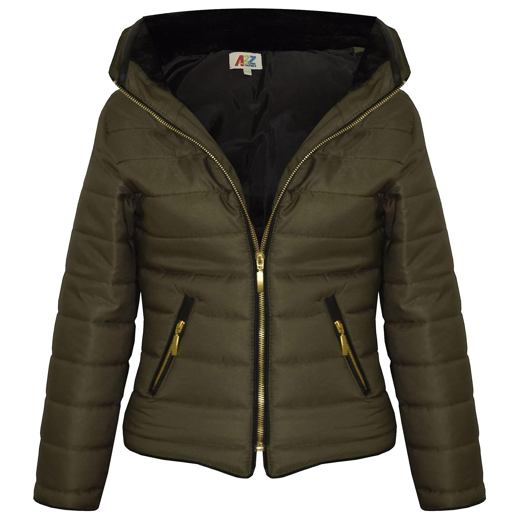 Girls Jacket Kids Padded Olive Puffer Bubble Fur Collar Quilted Warm Thick Coats