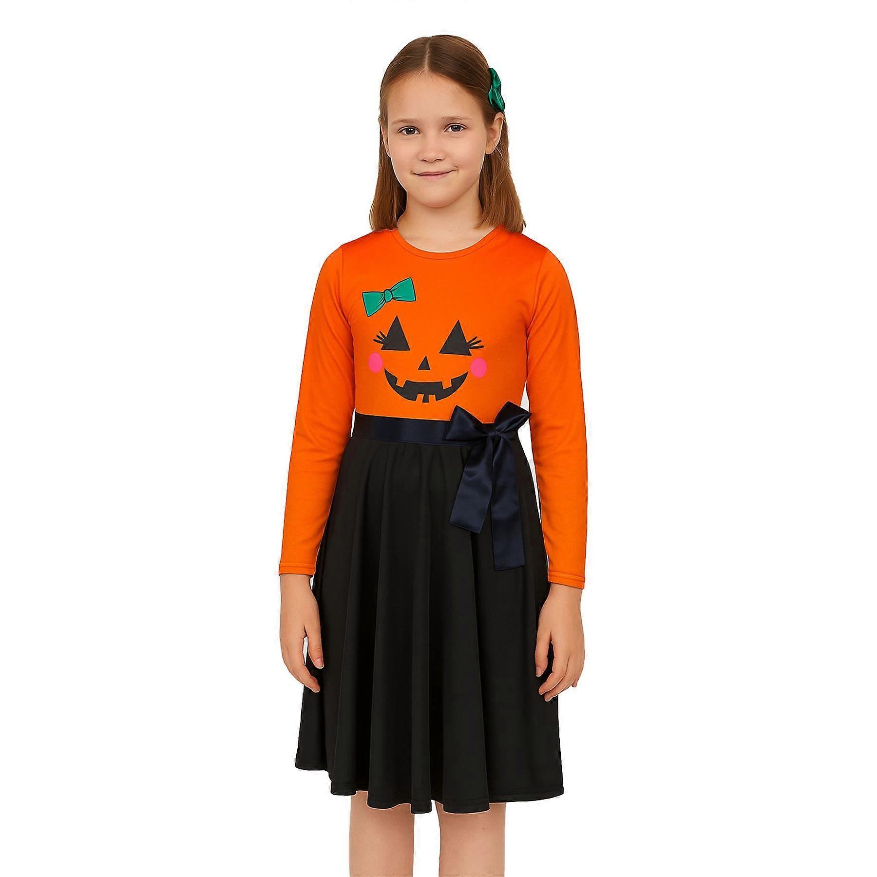 Girls Long Sleeves Pumpkin Print Halloween Skater Dress