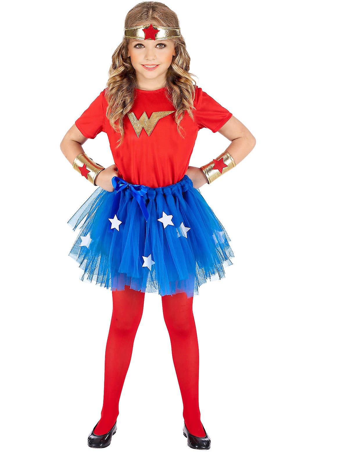 legendary comic book character This super heroine costume for girls includes a tiara, two bracelets, a t-shirt and a tutu (tights not included). The short-sleeved t-shirt is red. A golden W is present on the bust. The bottom is a tulle tutu made up of 2 layers for less transparency. Pretty white stars are present on the tutu. A tiara and 2 golden bracelets with a red star in the center are also included. They are made of fabric for greater comfort. This superheroine costume from comics and films will delight your daughter for Carnival or a superhero-themed birthday party. Accessories included: Tutu t-shirt Headband 2 bracelets Material: 100% polyester