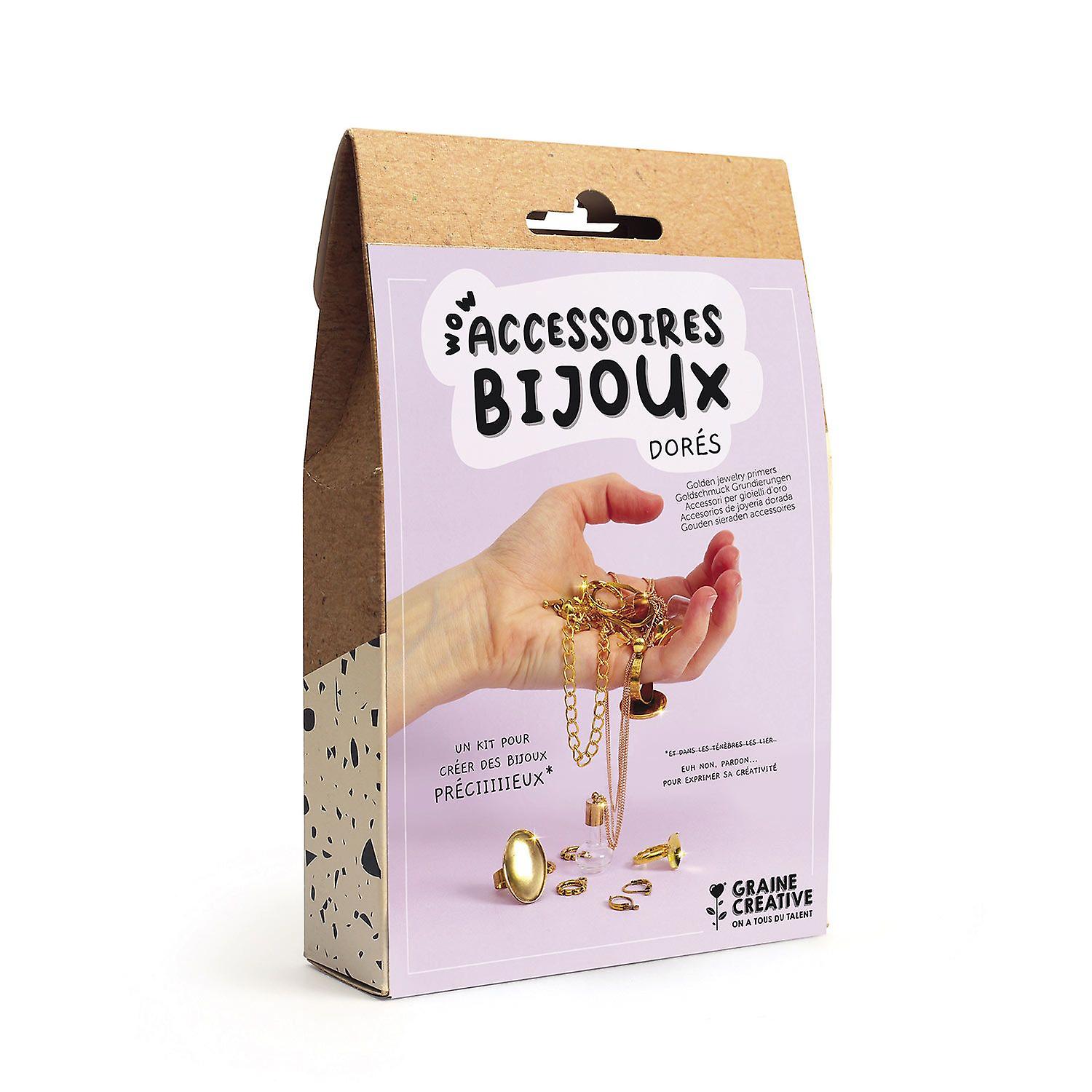 Make your own jewelry with this assortment of gold jewelry accessories. 37 accessories to create rings, bracelets, necklaces, earrings... Contents: 2 vial pendants, 1 golden necklace wire, 1 bracelet + clasp, 16 mini hooks, 3 magnetic clasps, 1 round hollow ring, 3 ring mountings picots, pair of hooks for bo, oval hollow ring, 4 ring clasps, 4 hinges. A multitude of possibilities are offered to you Add original beads to your creations: wood, shells, clay, silicone, plastic or even Heishi beads. Discover also our large collection of beads.