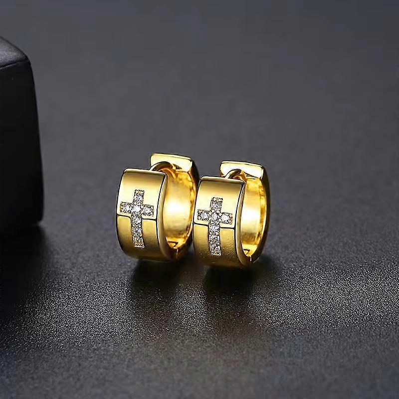 Guldpläterade örhängen med ett kors i strassStorleken på örhängen: 14 mm i diameter Skötseltips för smycken:♥Håll smycket borta från kemikalier, hög temperatur, bad, vatten, vänligen behandla smycket noggrant♥Förvara din produkt separat i en förseglad låda eller förseglad påse för att undvika oxidation