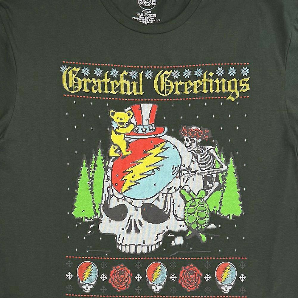 An official licensed Grateful Dead T-Shirt featuring the Grateful Greetings design motif. From our Christmas range of official licensed merch. This high quality unisex tee is available in green colorway. Comes in a wide range of sizes from Small through XX-Large, subject to availability.