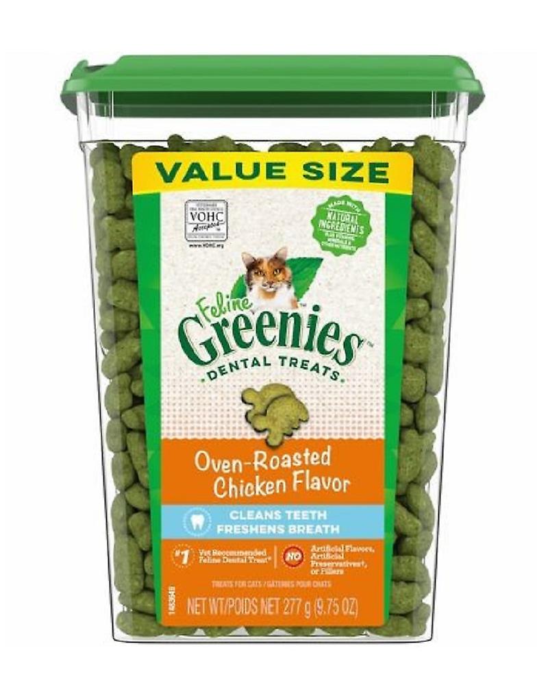 Greenies 10205252 Dental Care Chicken Flavor Adult Natural Cat Treats, 9.75 oz. Features: Convenient tub contains 9.75 oz. of dental cat treats in oven roasted chicken flavor Cat treats have a crunchy texture that helps clean teeth, reduce tartar buildup, and freshen breath #1 vet-recommended feline dental treat Cat treats are made with natural ingredients plus added vitamins, minerals, and other nutrients; nutritionally complete and balanced for adult cats Tasty cat treats have no artificial flavors, no artificial preservatives, and contain less than 2 calories per treat