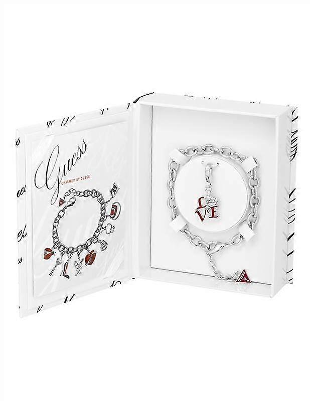 Guess ladies charm bracelet with first silver tone heart charm with the Guess emblem.