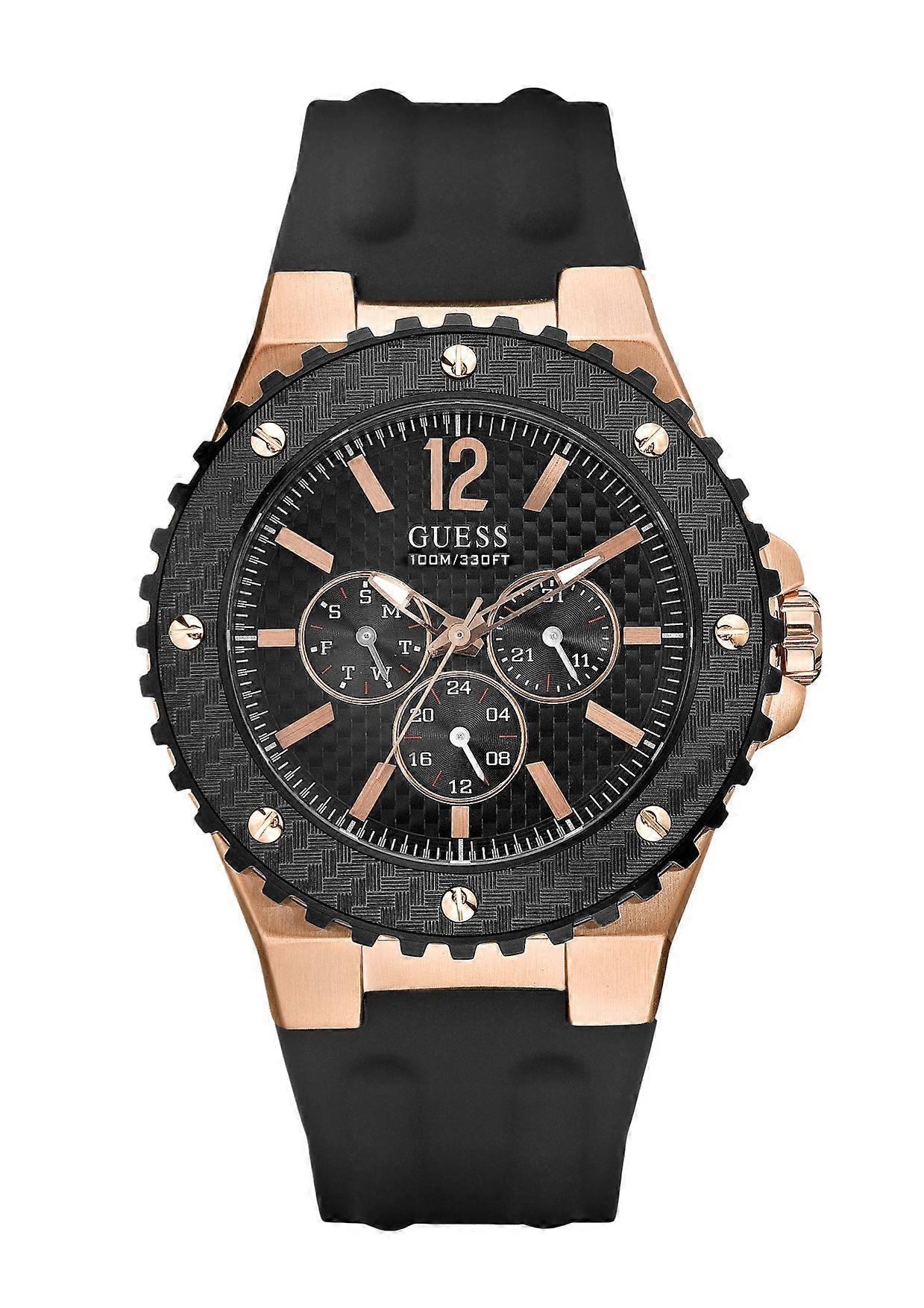 Guess Mens Overdrive Multi Dial Watch 100m Rose Gold Black Rubber Strap