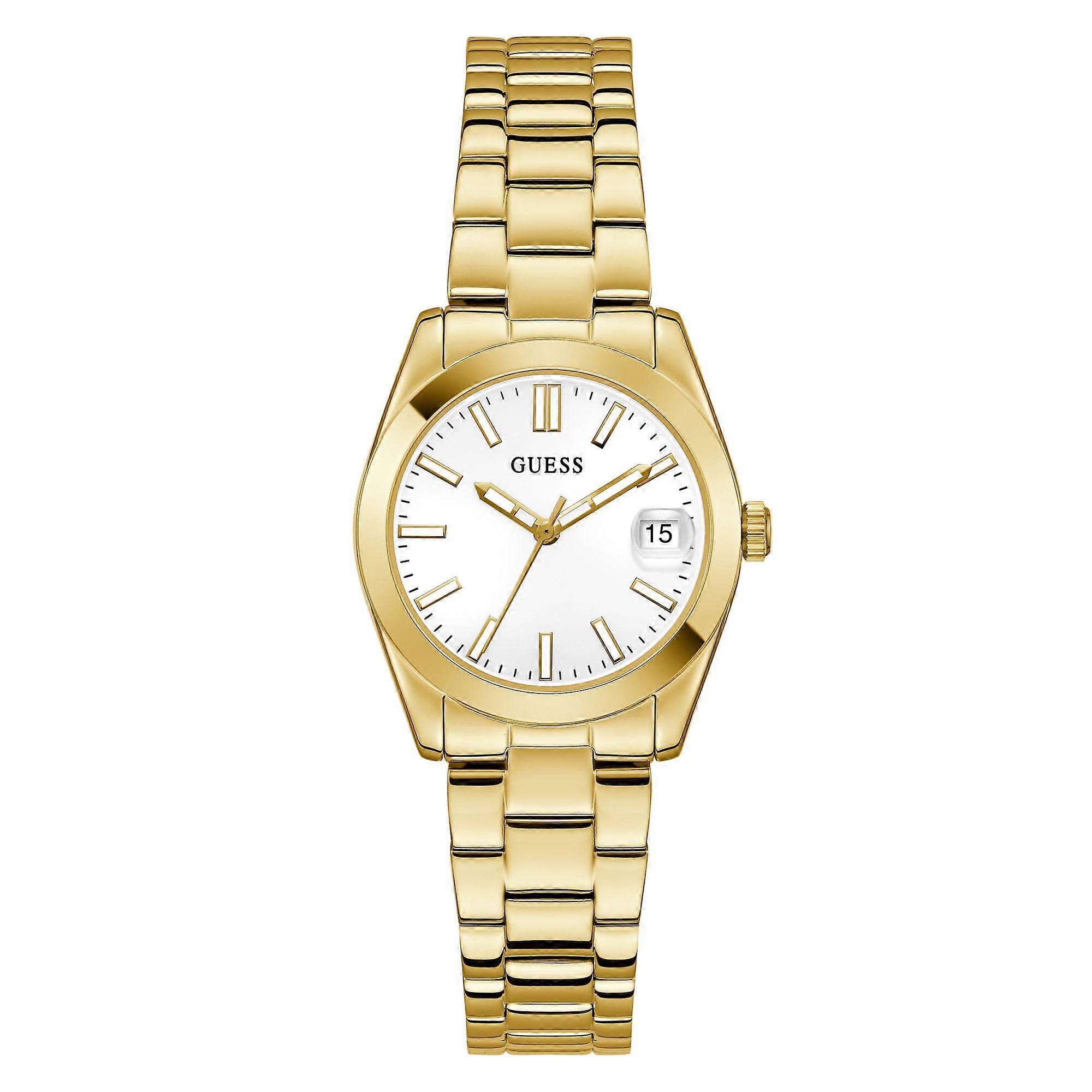 Hersteller:Guess ModellNr :GW0934L2 Zifferblatt:analog, Farbe: weiß mit Datumsanzeige Gehäuse:Edelstahlgehäuse goldfarben, Durchmesser ca. 32,0 mm (ohne Krone), Lünette goldfarben, Höhe ca. 8,4 mm Gehäuseboden:Edelstahl mit Herstellerlogo Armband:Edelstahlarmband goldfarben, Breite: ca. 1,7 cm Länge der Uhr: ca. 19,0 cm Faltschließe, Dichtheit:Wasserdicht 3 ATM (30 m) Funktionen / Anzeigen: Quarzwerk, gehärtetes Mineralglas, Stunden - Minuten - Stundenanzeige, Datum, Lieferumfang:Auslieferung in Guess Verpackung