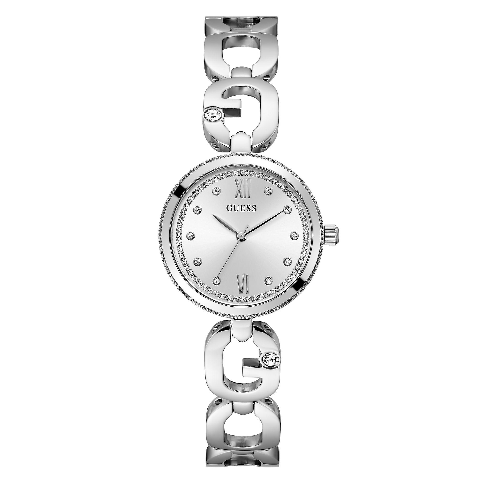 Hersteller:Guess ModellNr :GW0759L1 Zifferblatt:analog, Farbe: silber mit weissen SteinchenGehäuse:Edelstahlgehäuse silberfarben,Durchmesser ca. 30,0 mm (ohne Krone), Höhe ca. 8,8 mmGehäuseboden:Edelstahl mit HerstellerlogoArmband:Edelstahlarmband silberfarben,Breite: ca. 1,4 cm Länge der Uhr: ca. 19,0 cmFaltschließeDichtheit:Wasserdicht 3 ATM (30 m)Funktionen / Anzeigen:Quarzwerk,gehärtetes Mineralglas,Stunden - Minuten - Sekundenanzeige,Lieferumfang:Auslieferung in Guess Verpackung