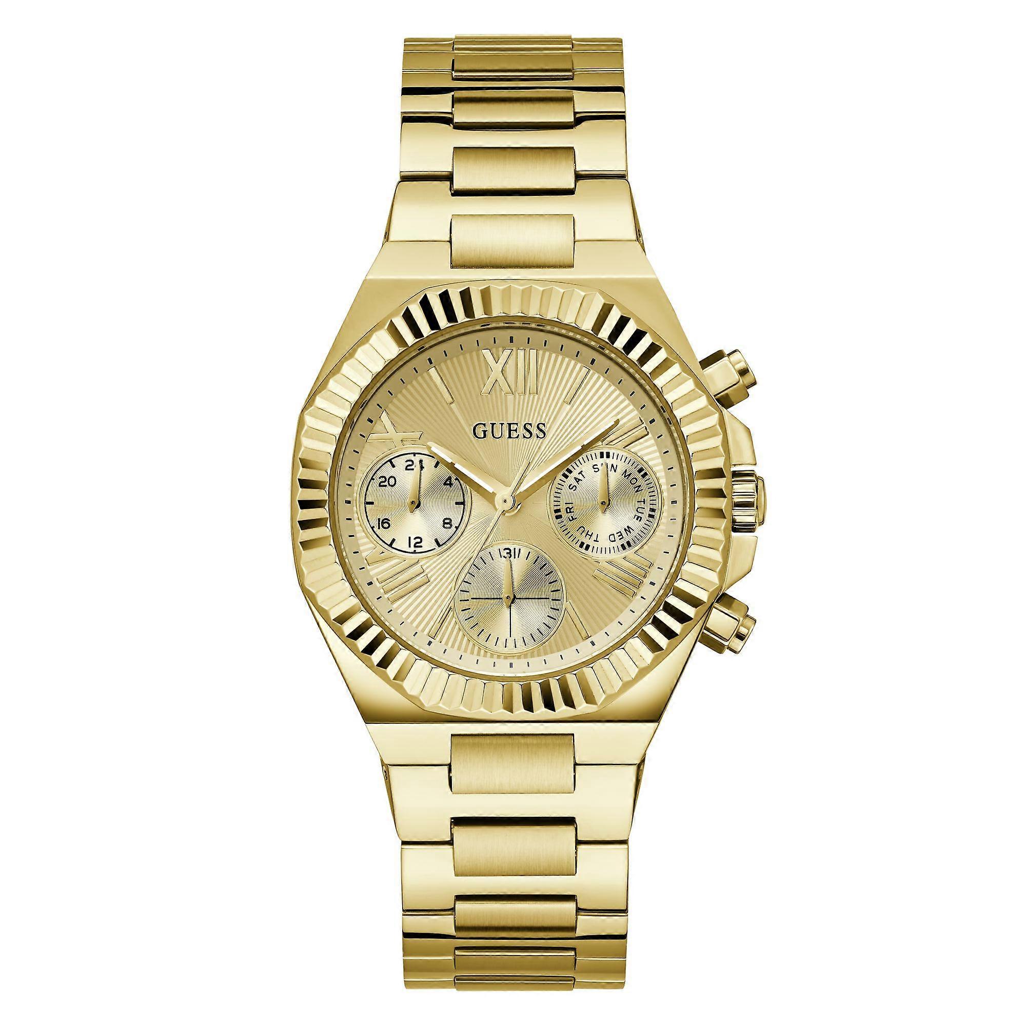 Hersteller:Guess ModellNr :GW0769L2 Zifferblatt:analog, Farbe: gold Gehäuse:Edelstahlgehäuse goldfarben, Lünette goldfarben, Durchmesser ca. 38,0 mm (ohne Krone), Höhe ca. 10,2 mm Gehäuseboden:Edelstahl mit Herstellerlogo Armband:Edelstahlarmband goldfarben, Breite: ca. 2,2 cm Länge der Uhr: ca. 19,0 cm Faltschließe Dichtheit:Wasserdicht 5 ATM (50m) Funktionen / Anzeigen: Quarzwerk, gehärtetes Mineralglas, Stunden - Minutenanzeige, Datumsanzeige Lieferumfang:Auslieferung in Guess Verpackung