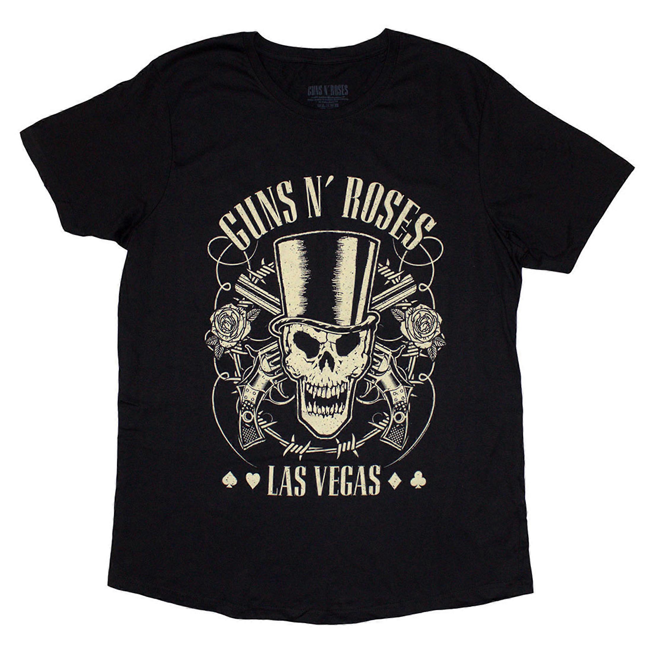 An official licensed Guns N' Roses Ladies Tee featuring the 'Top Hat, Skull & Pistols Las Vegas' design motif. This high quality t-shirt design is available in the black colourway. We offer a range of sizes from Small through XX-Large, subject to stock availability.