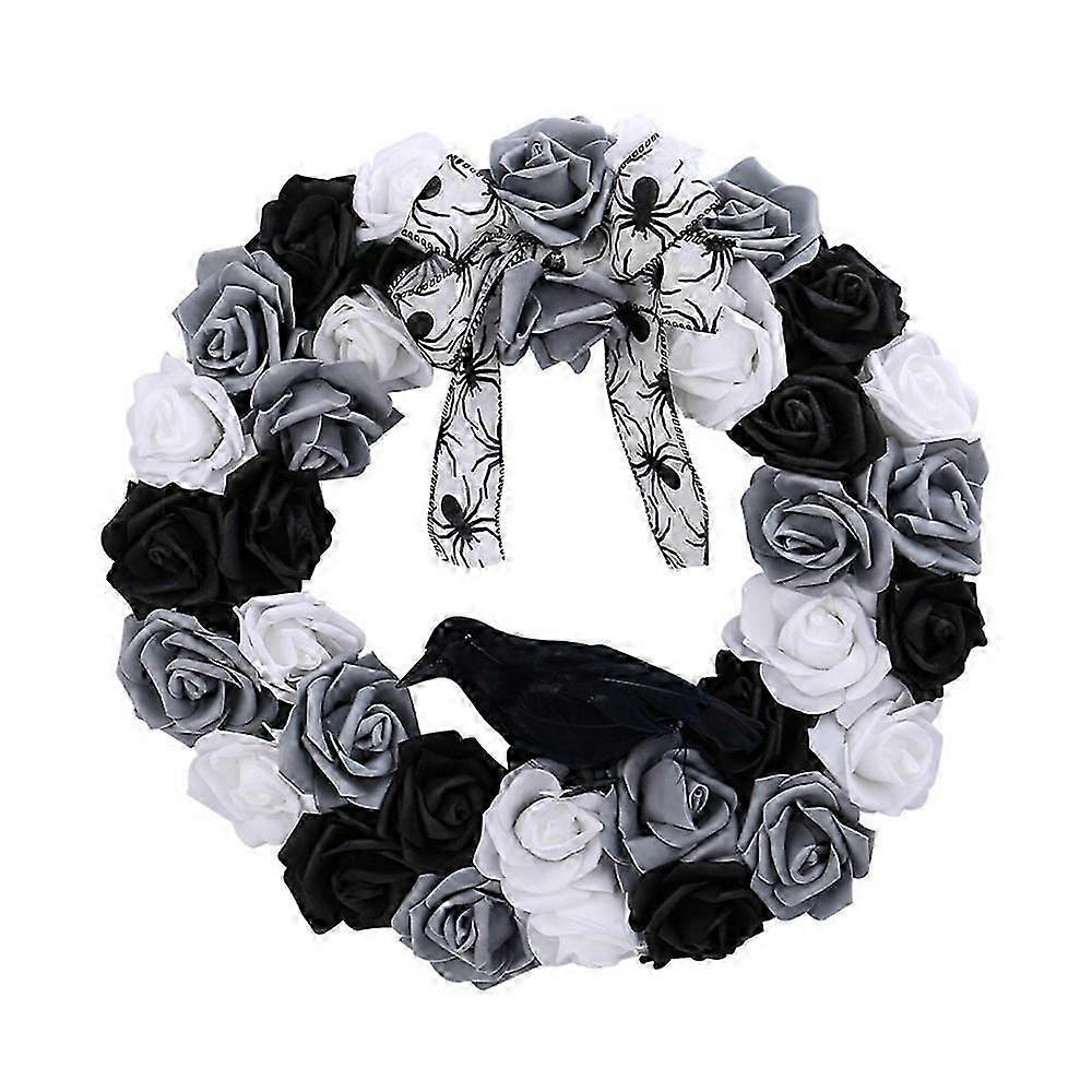 Halloween Wreath Black White Rose Crow Ghastly Party Decor Artificial Flower Garland Spooky Door Hanging